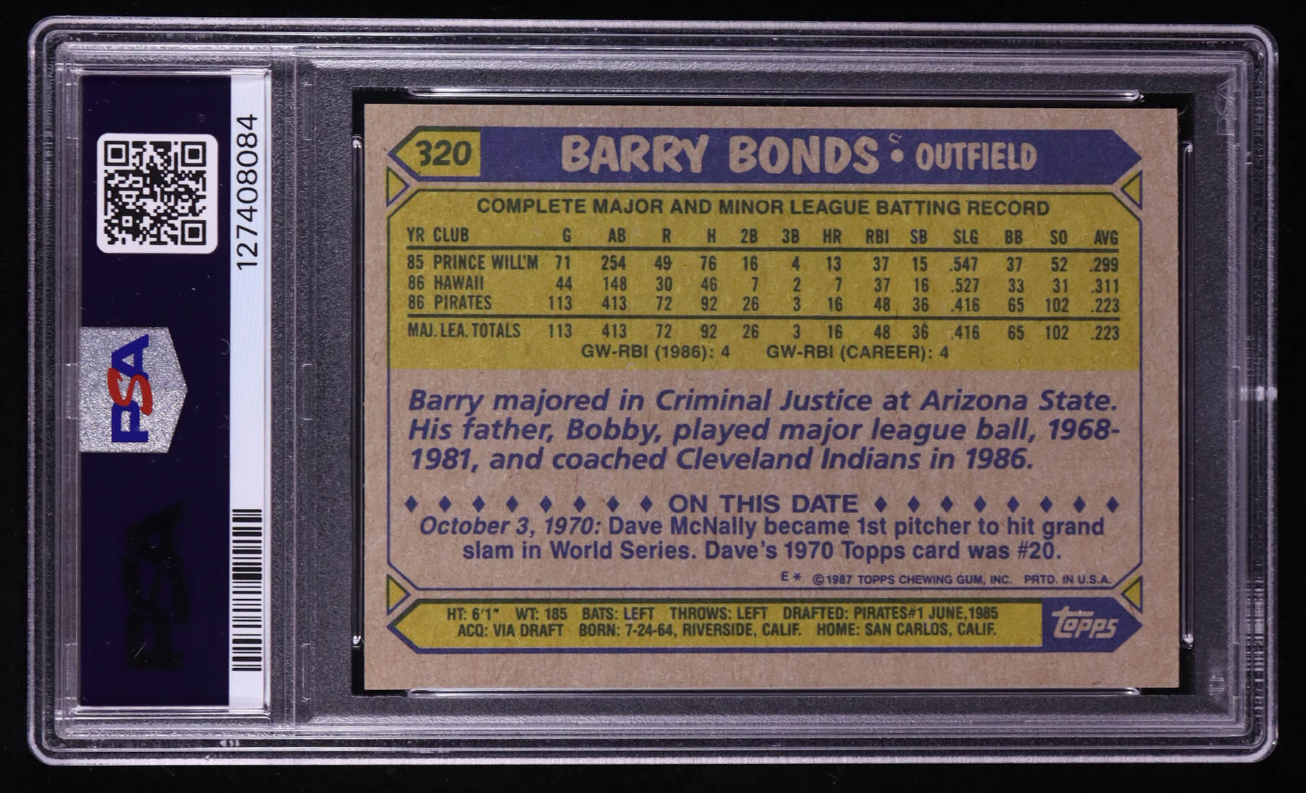 Barry Bonds 1987 Topps #320 RC (PSA 9)