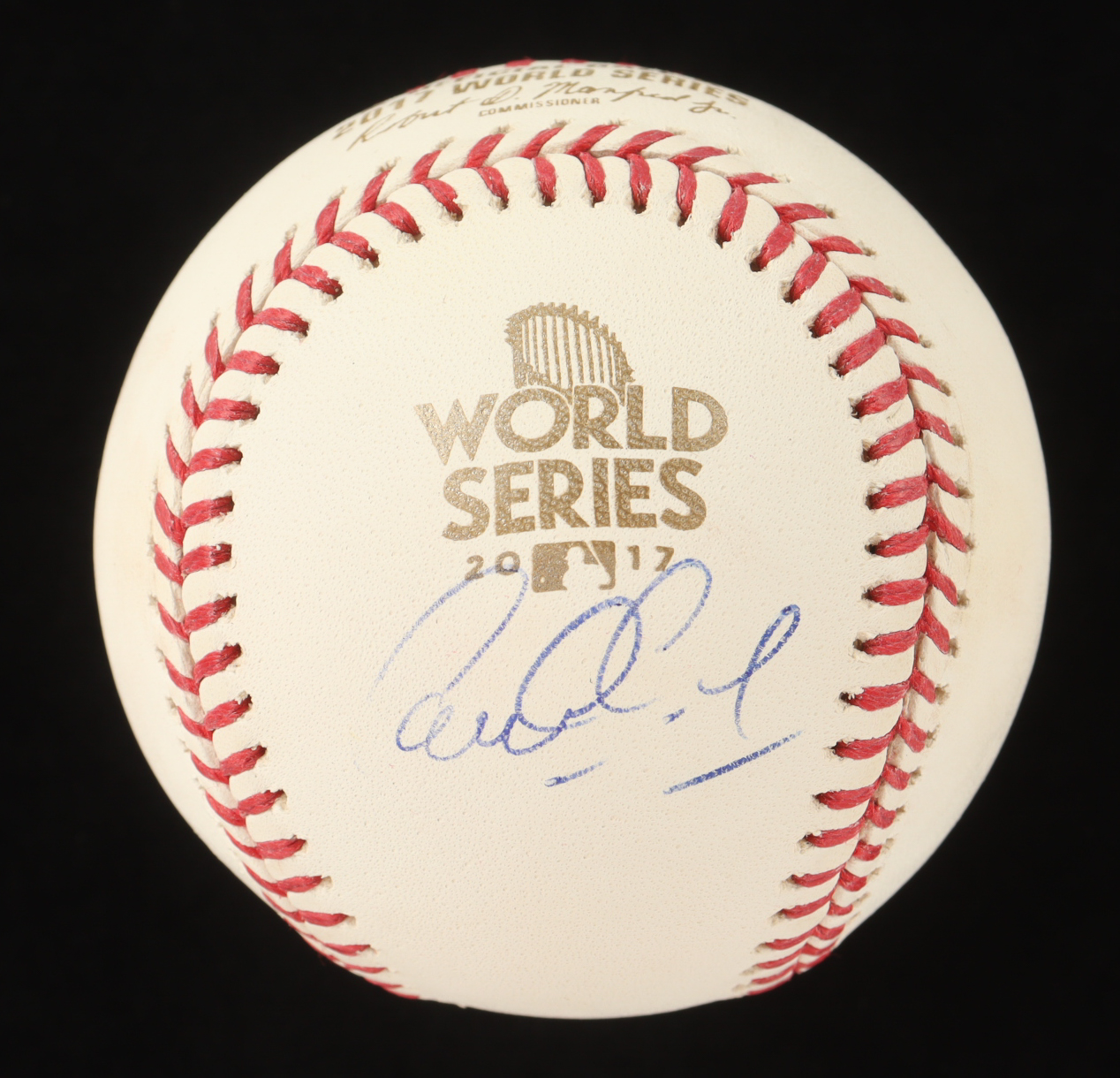 Rawlings Official 2017 World Series logo baseball. Hand-signed by Carlos Correa.
