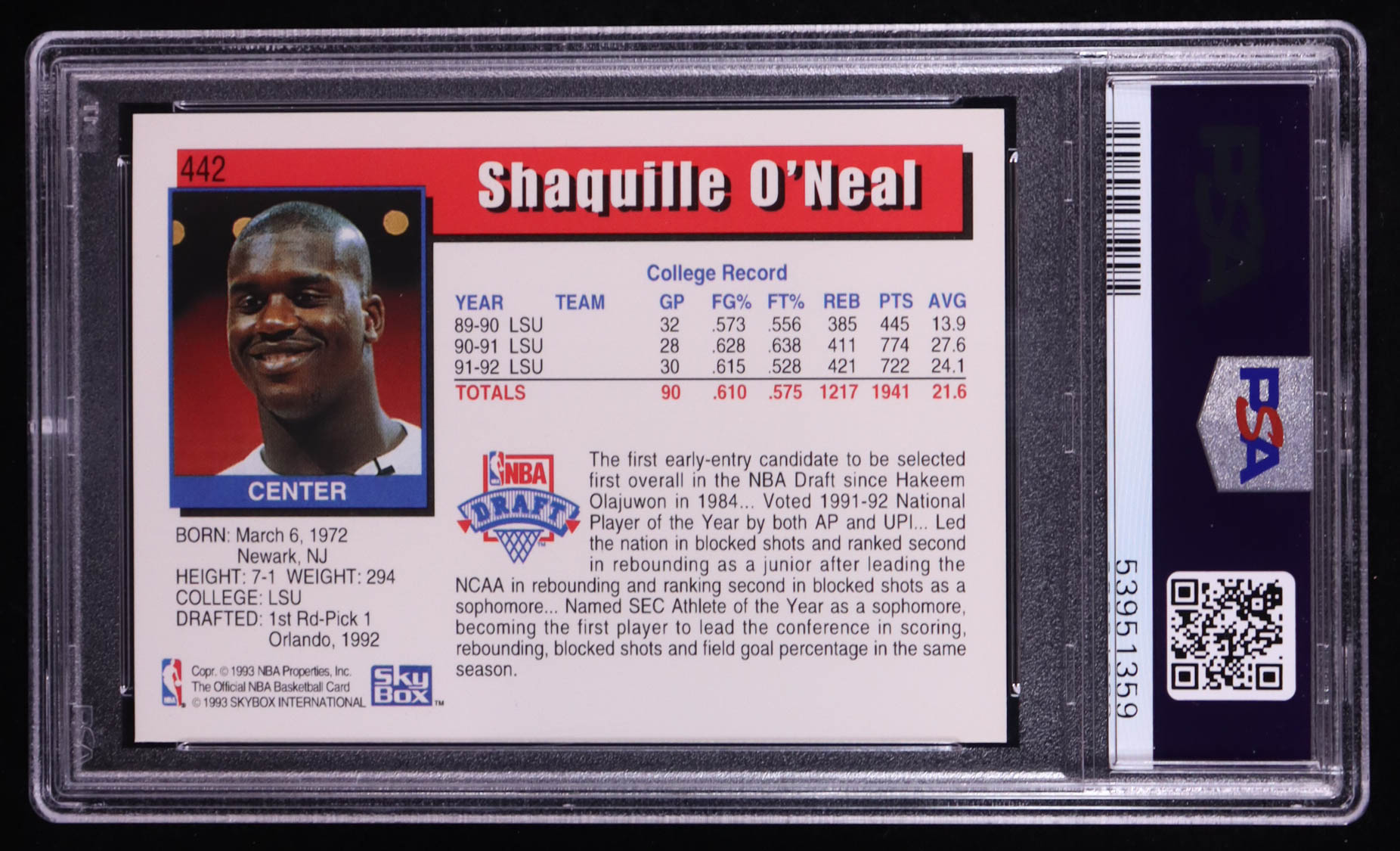 Shaquille O'Neal 1992-93 Hoops #442 RC (PSA 9)