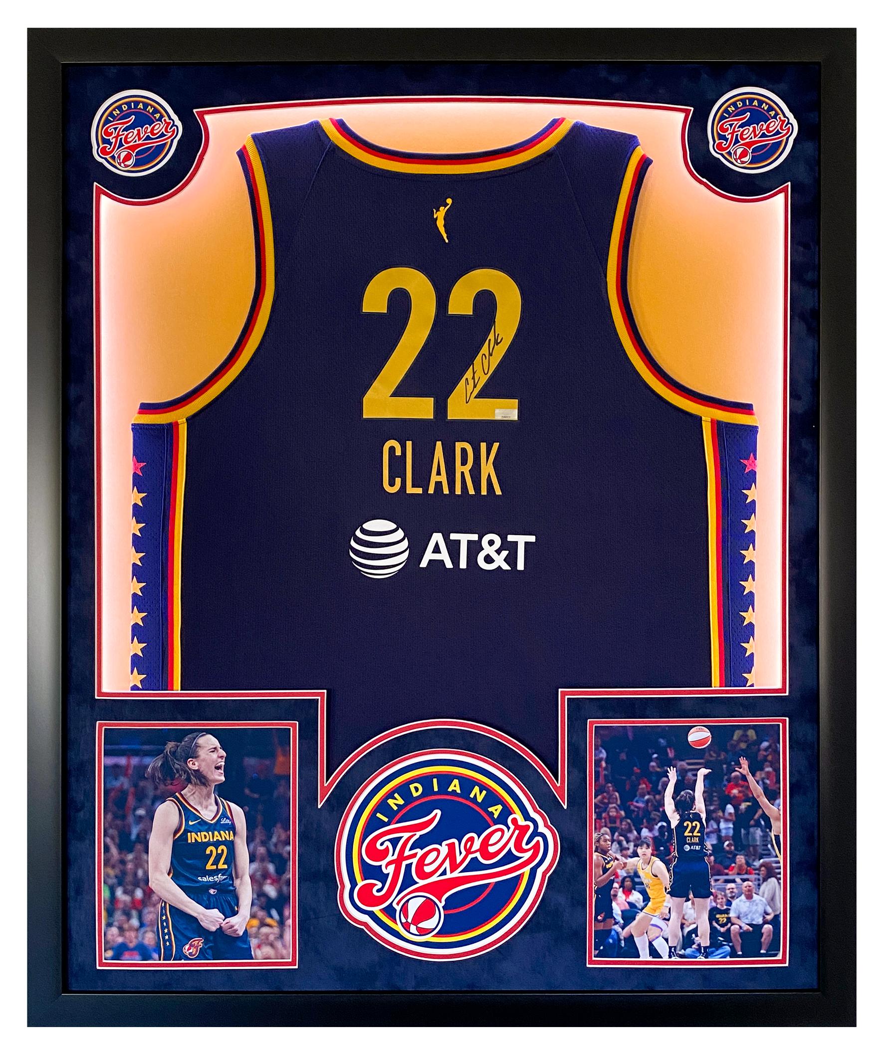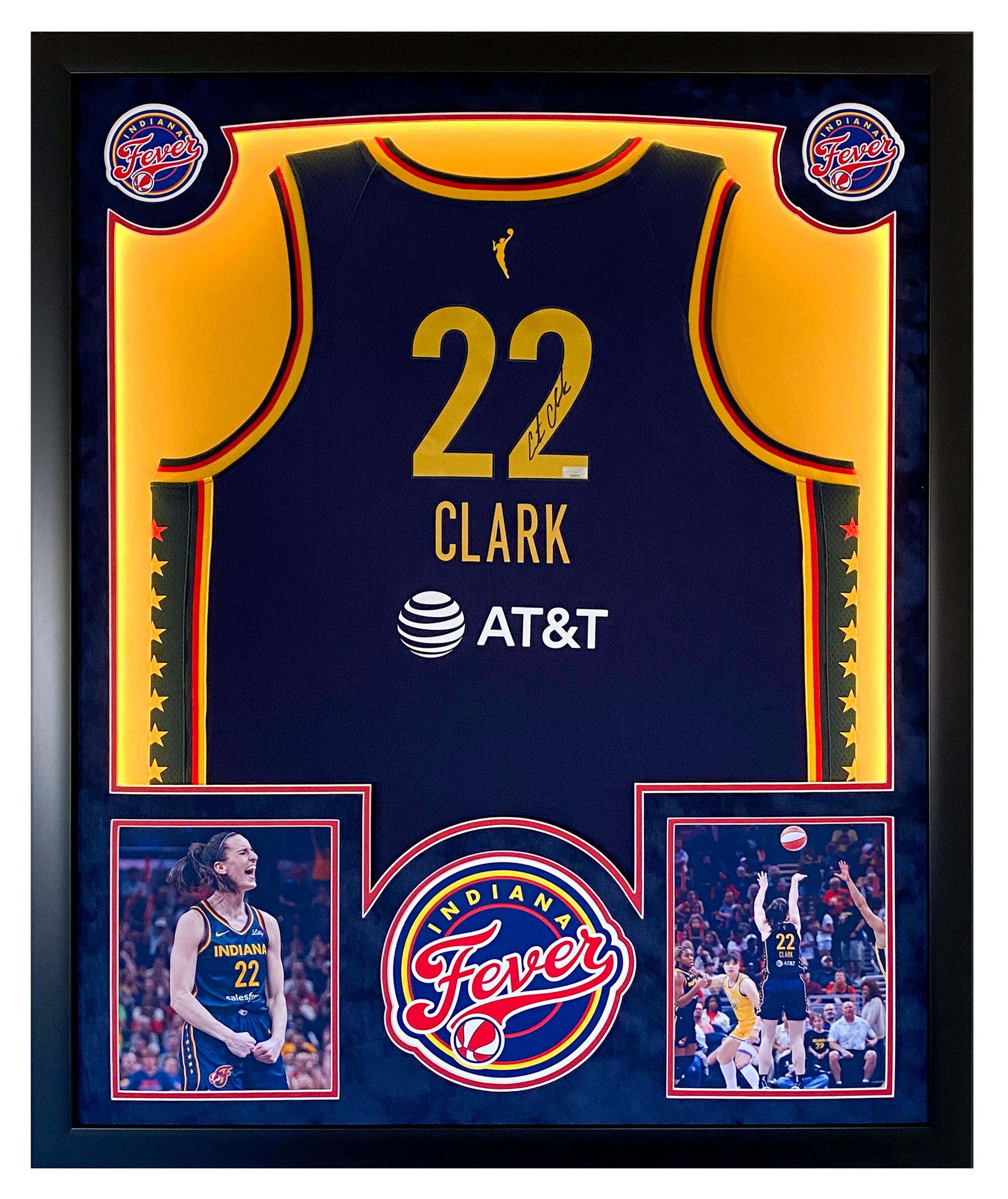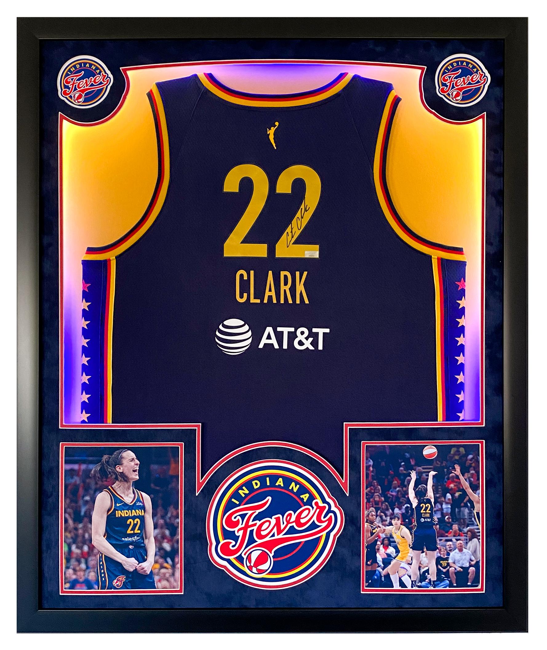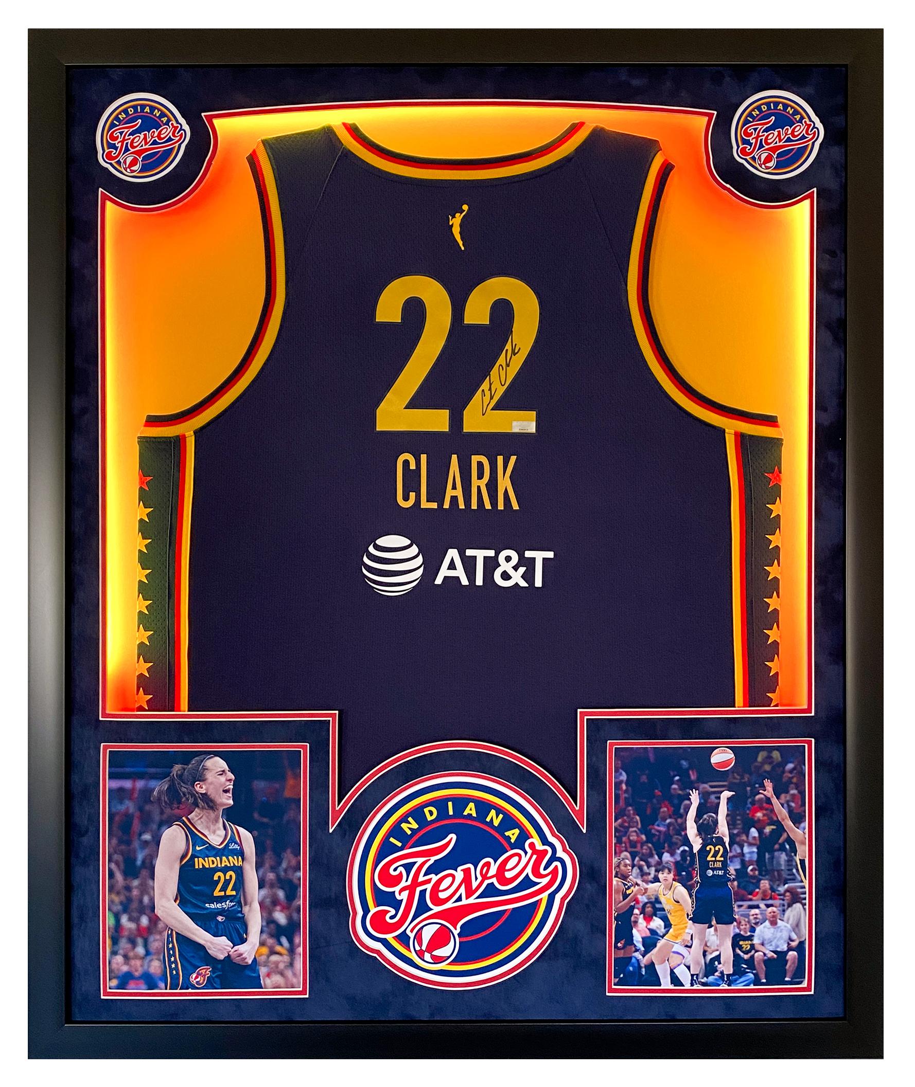 Custom framed display measures 32" x 40" in size and features a Nike jersey that has been hand-signed by Caitlin Clark (Indiana Fever). LED Lights have been added to this frame to give it a one of a kind look. With the USB Powered Lights, simply turn it on when you want to light it up and show it off.
