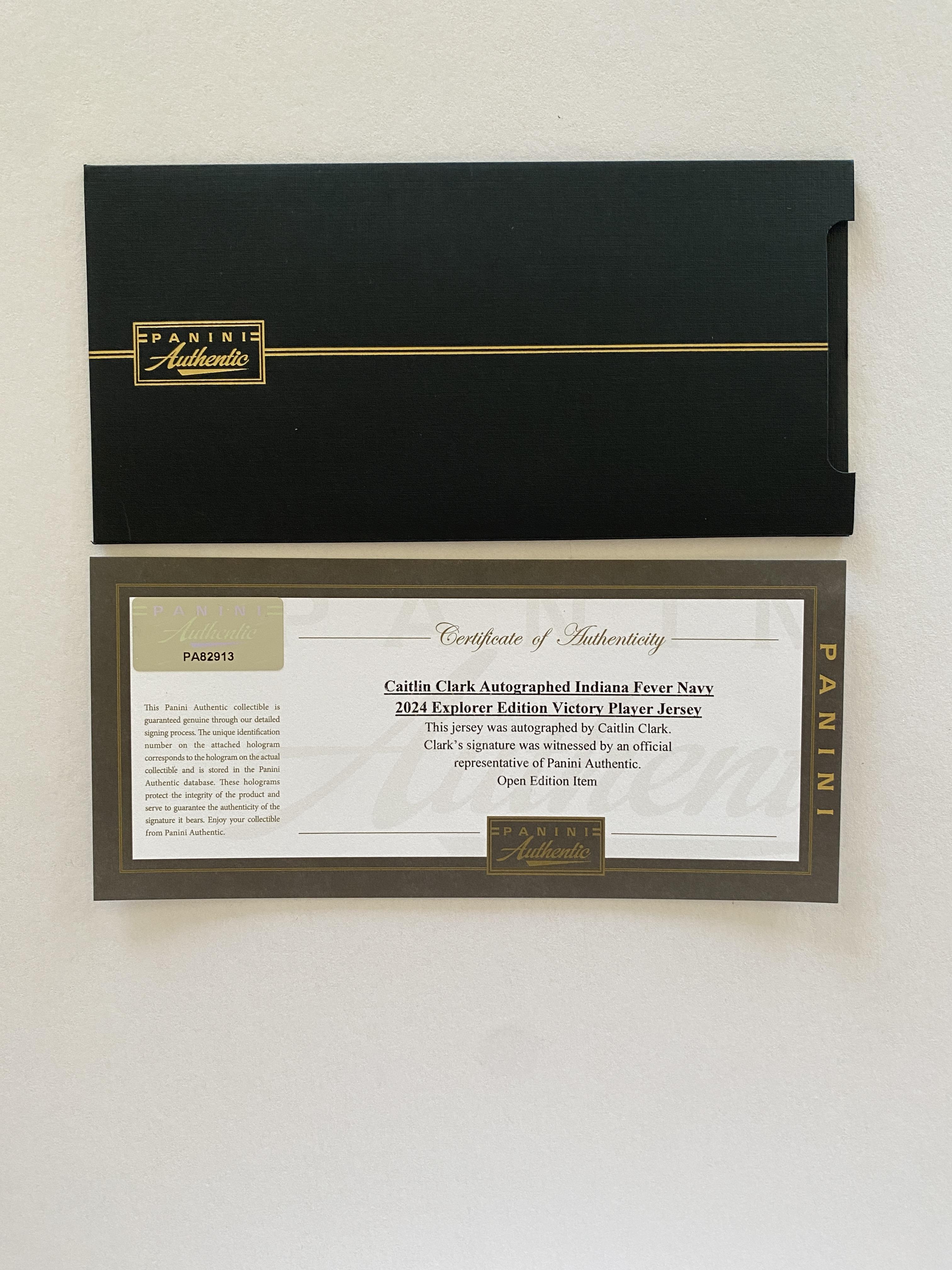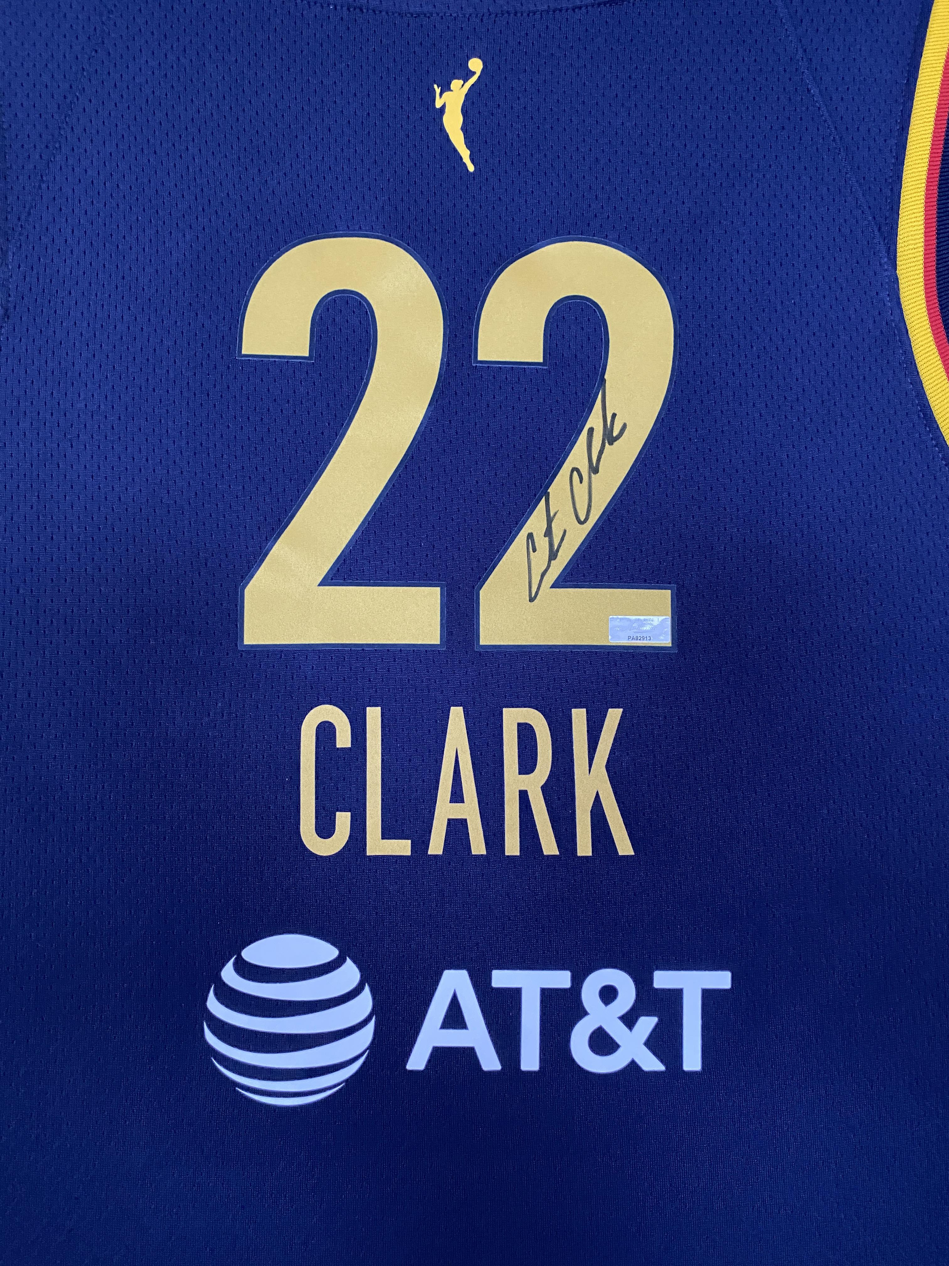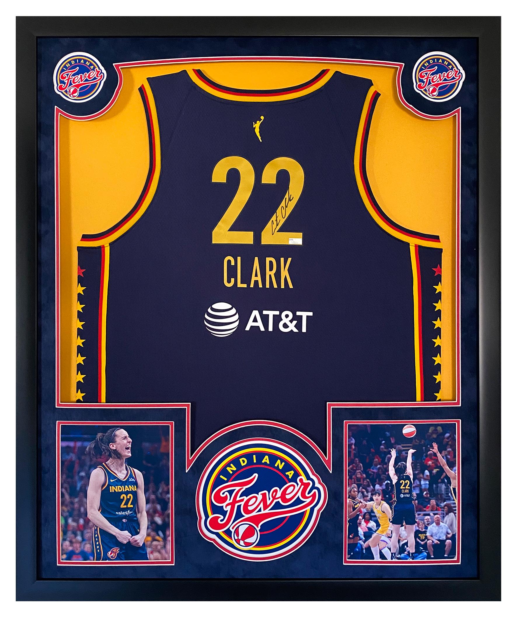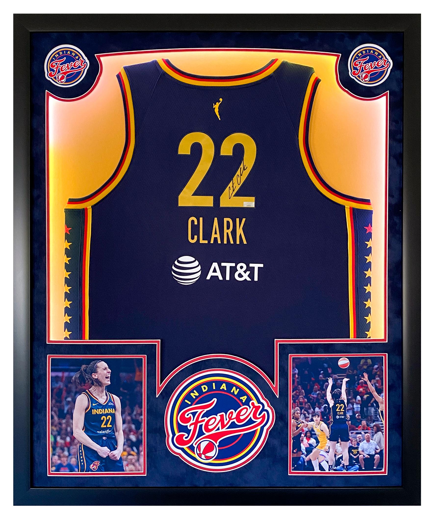 Custom framed display measures 32" x 40" in size and features a Nike jersey that has been hand-signed by Caitlin Clark (Indiana Fever). LED Lights have been added to this frame to give it a one of a kind look. With the USB Powered Lights, simply turn it on when you want to light it up and show it off.
