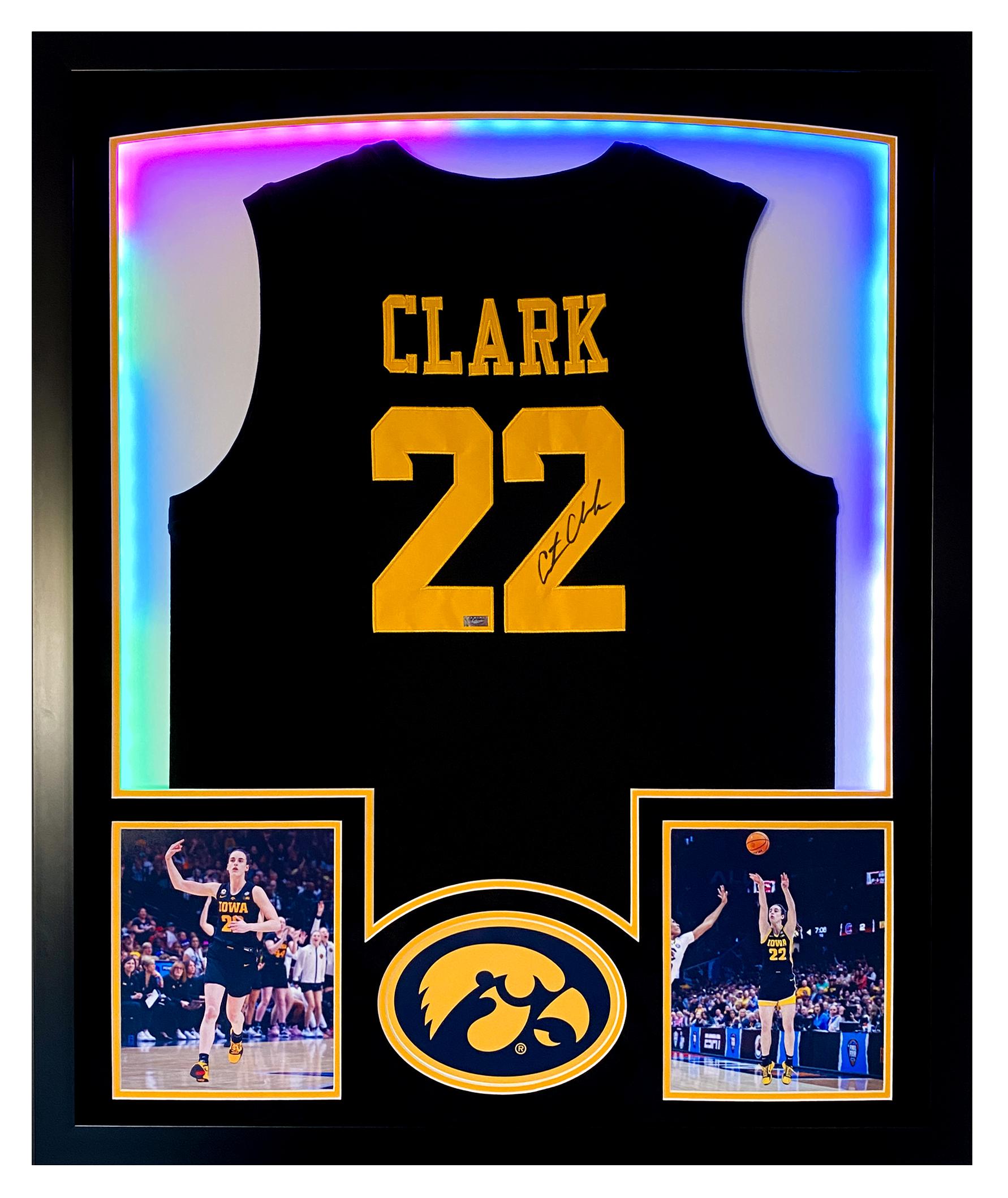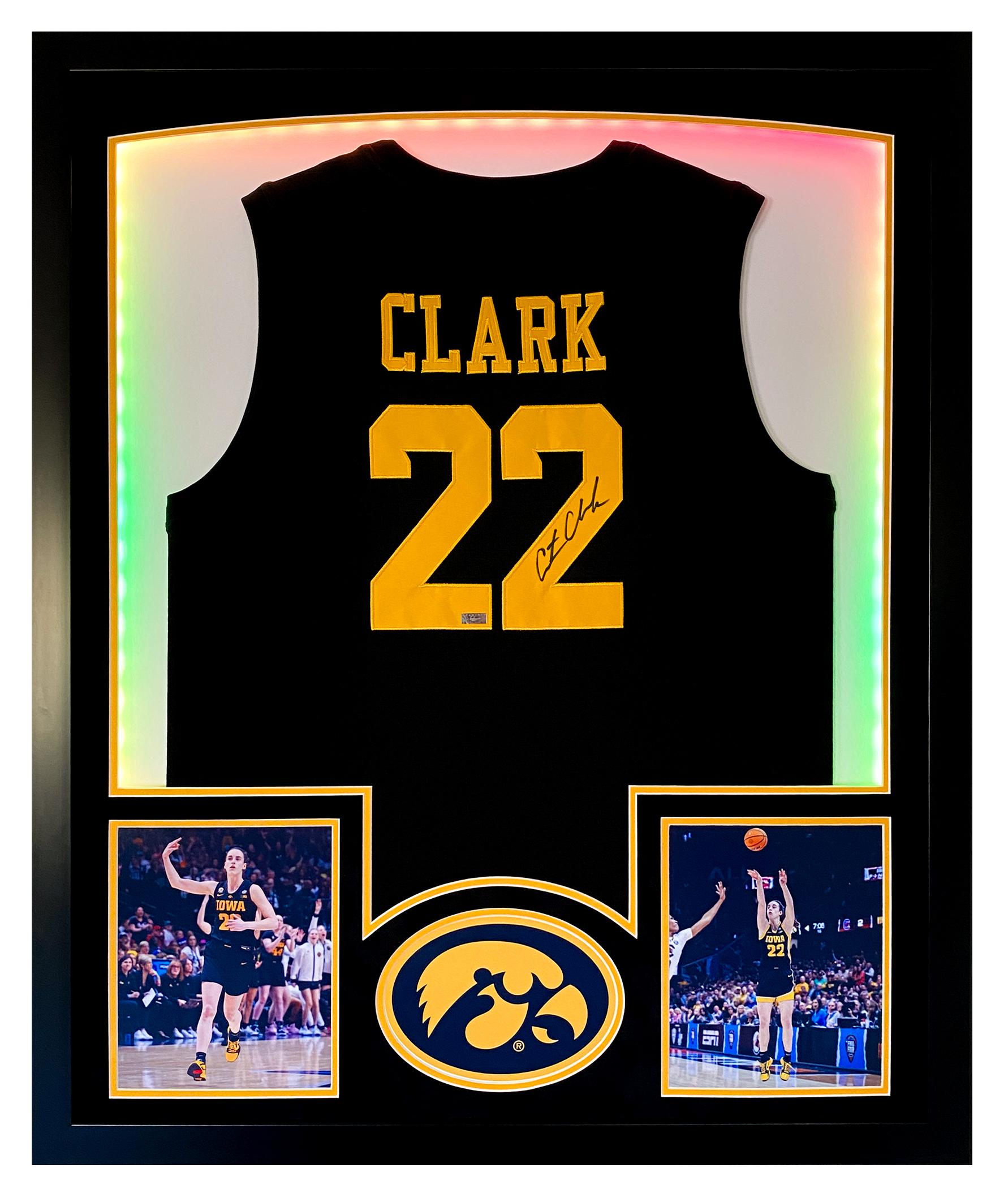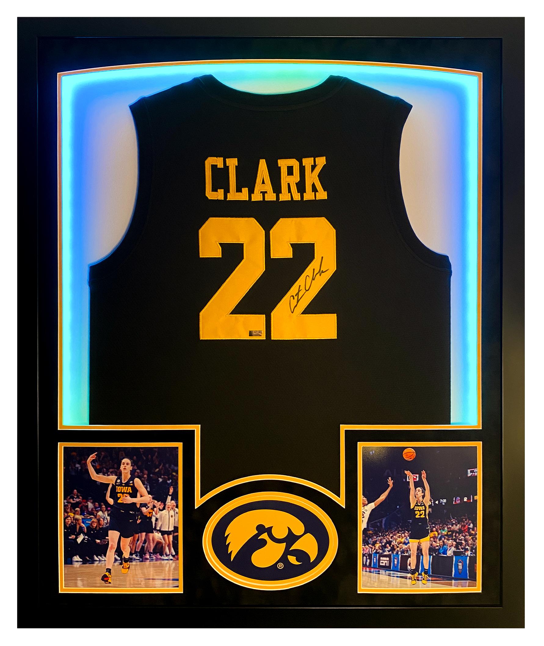Custom framed display measures 32" x 40" in size and features a Nike jersey that has been hand-signed by Caitlin Clark. LED Lights have been added to this frame to give it a one of a kind look. With the USB Powered Lights, simply turn it on when you want to light it up and show it off.
