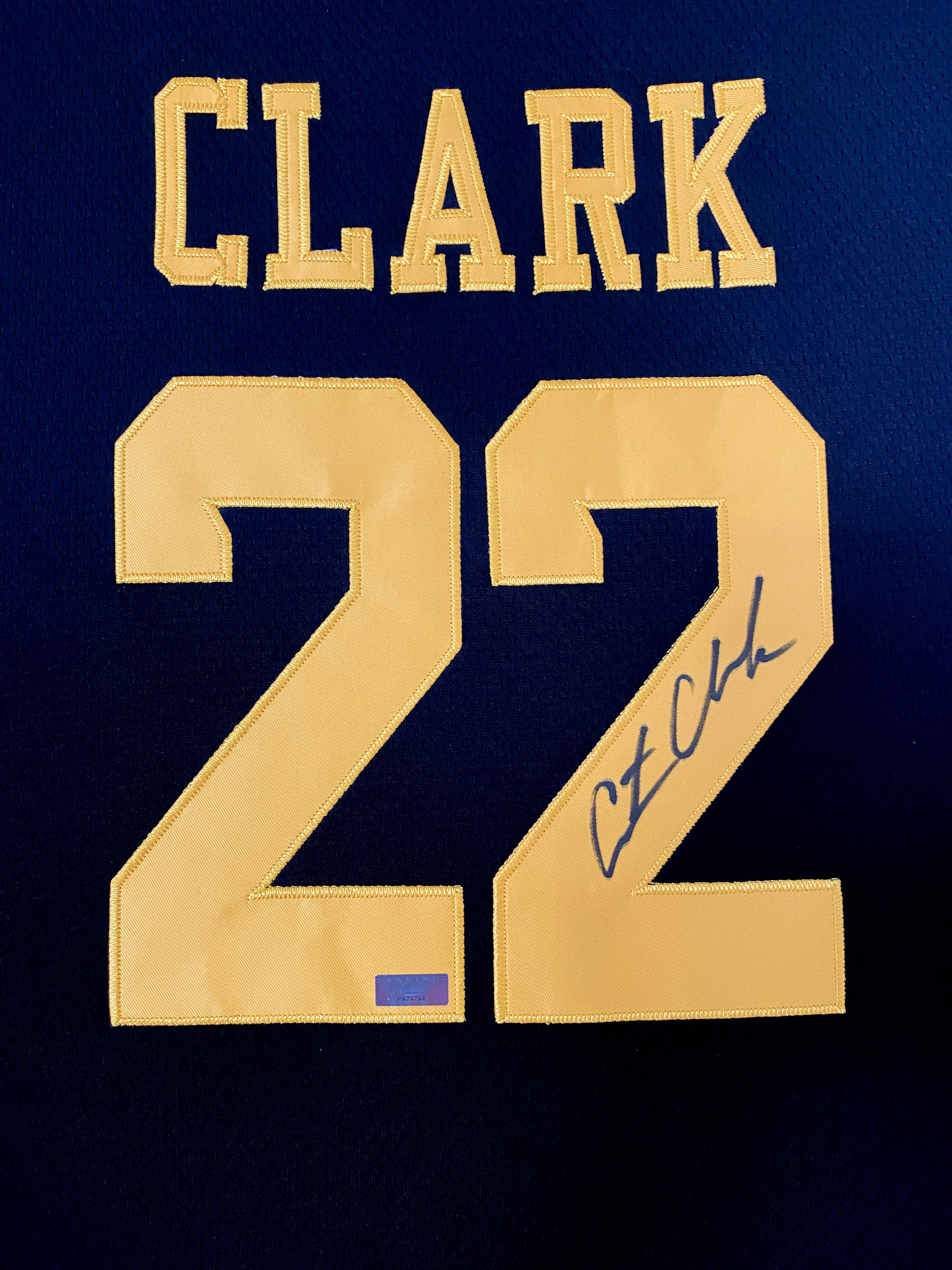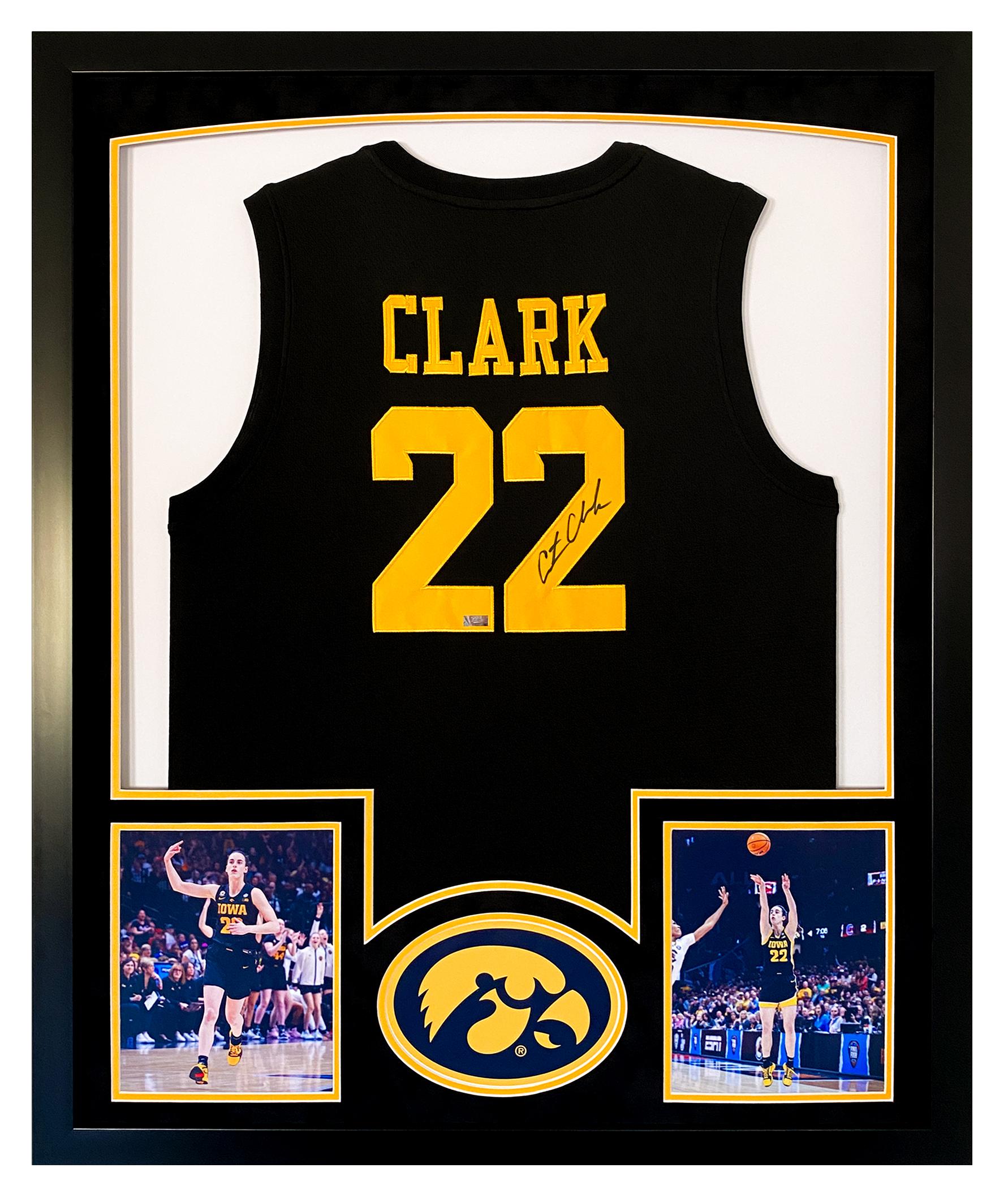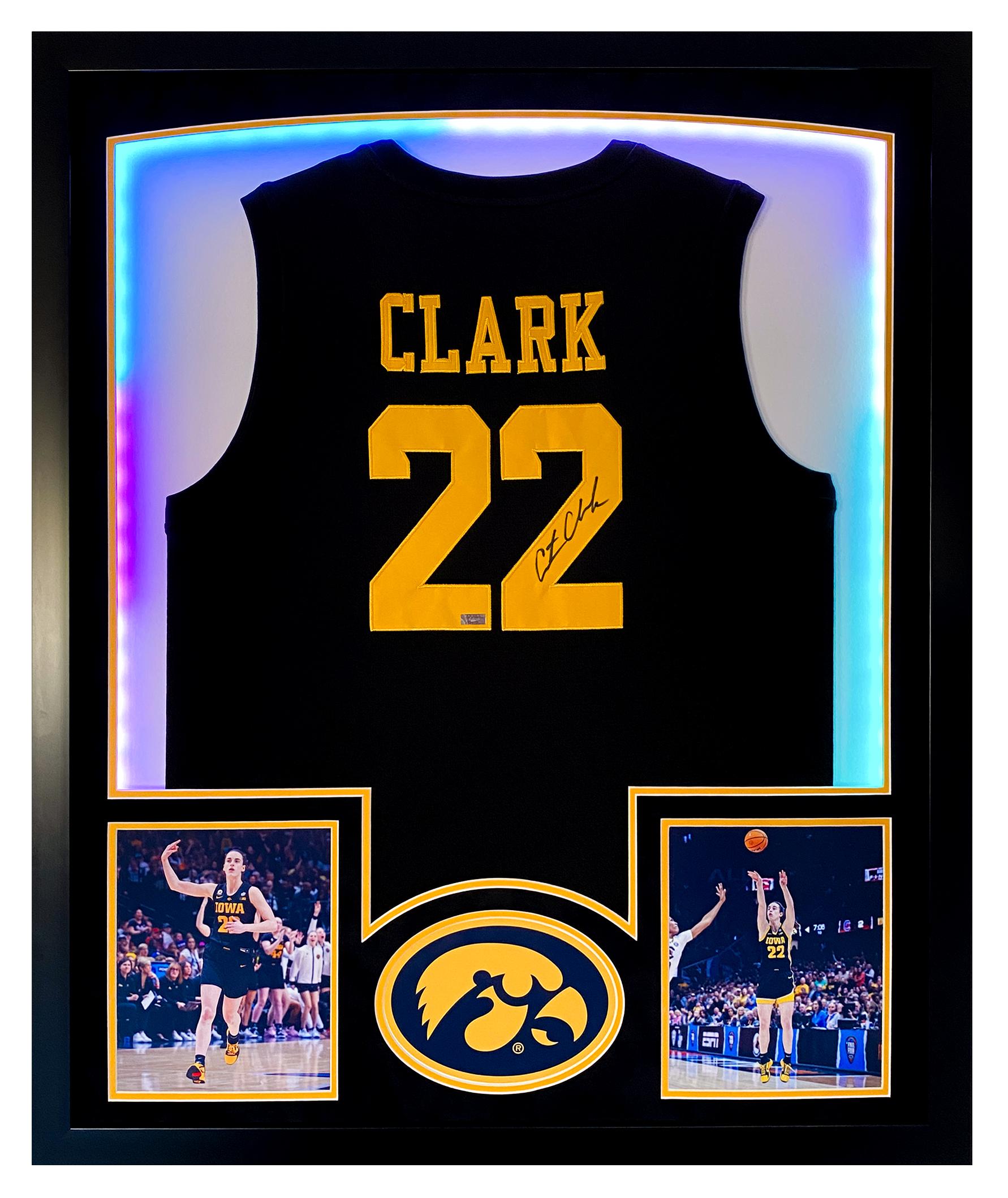 Custom framed display measures 32" x 40" in size and features a Nike jersey that has been hand-signed by Caitlin Clark. LED Lights have been added to this frame to give it a one of a kind look. With the USB Powered Lights, simply turn it on when you want to light it up and show it off.