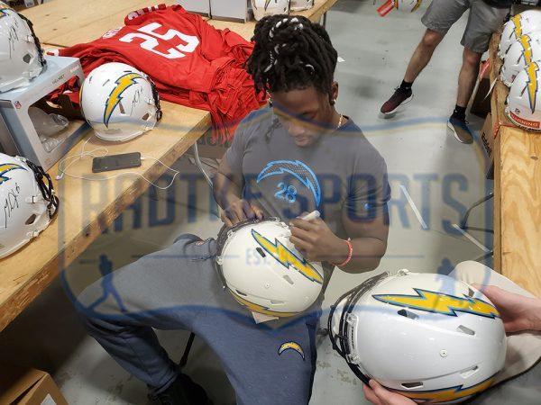 Riddell Los Angeles Chargers full-size authentic on-field speed helmet has been hand-signed by Melvin Gordon and LaDainian Tomlinson (HOF).