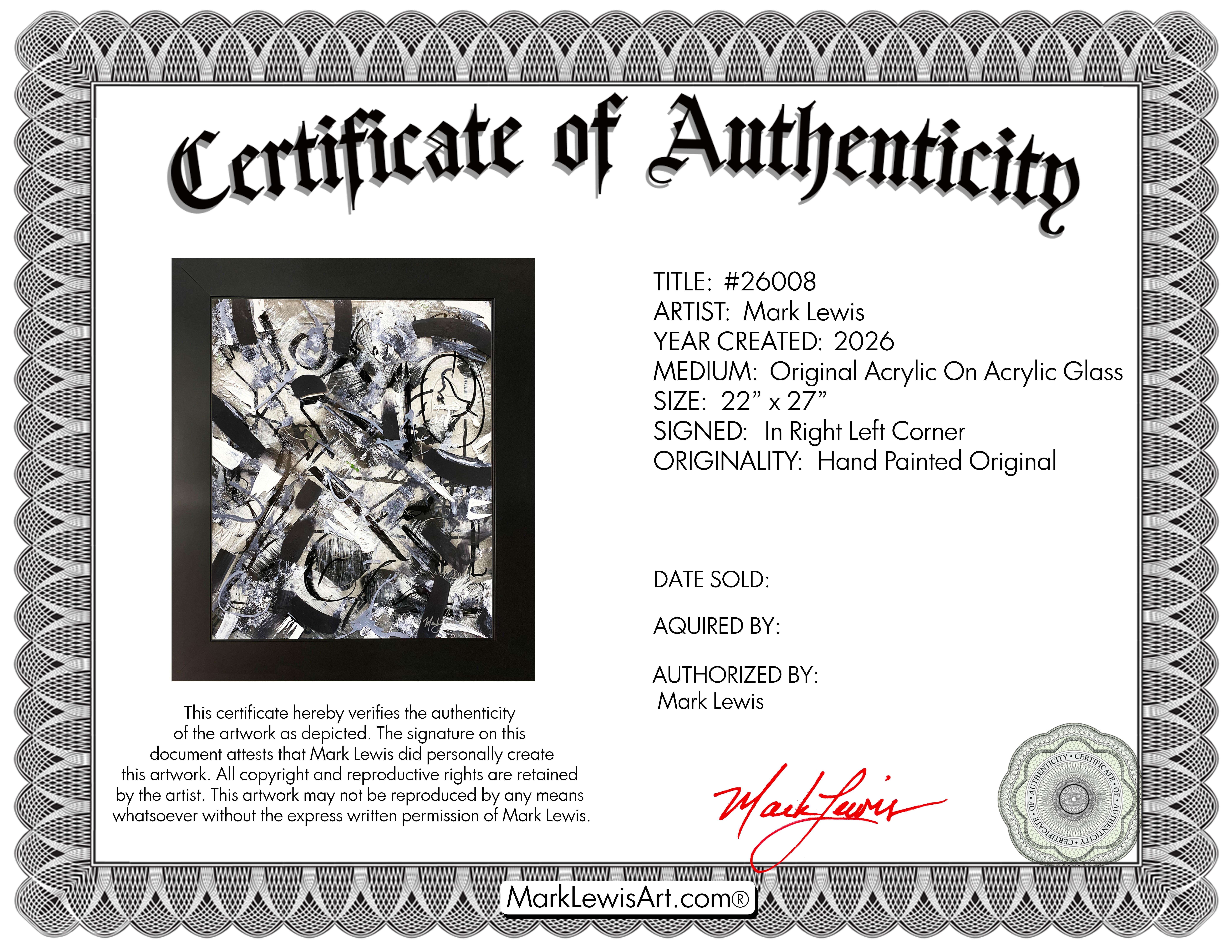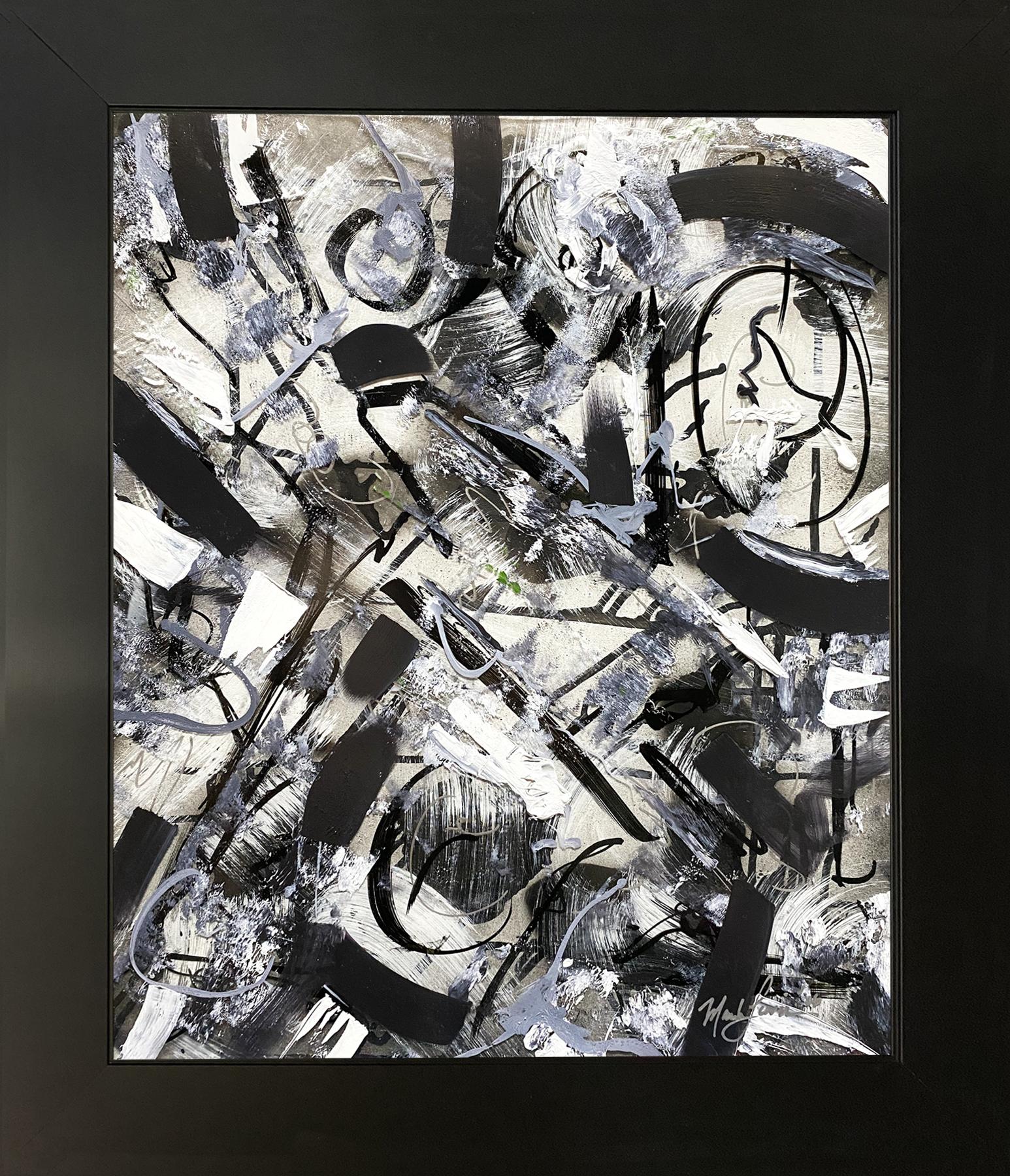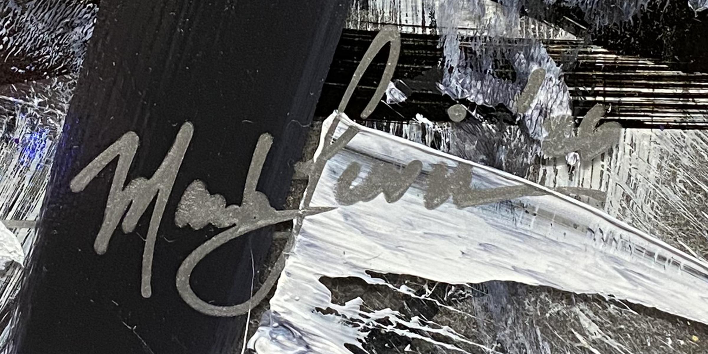Evaluation: A powerful demonstration of modern abstract expressionism, this work pulses with a sophisticated and high contrast palette. Created by Mark Lewis the great grand nephew of MLB legend Cy Young the piece showcases a complex layering of charcoal blacks and slate grays plus stark titanium whites. Sweeping gestural strokes and bold architectural lines create a sense of organized chaos while aggressive palette knife textures provide a rugged and rhythmic contrast. Painted directly onto premium acrylic glass, the work achieves a luminous 3D depth where heavy pigments appear to float over a translucent ground. It is a striking exploration of movement and tension bridging a storied American lineage with contemporary industrial energy.