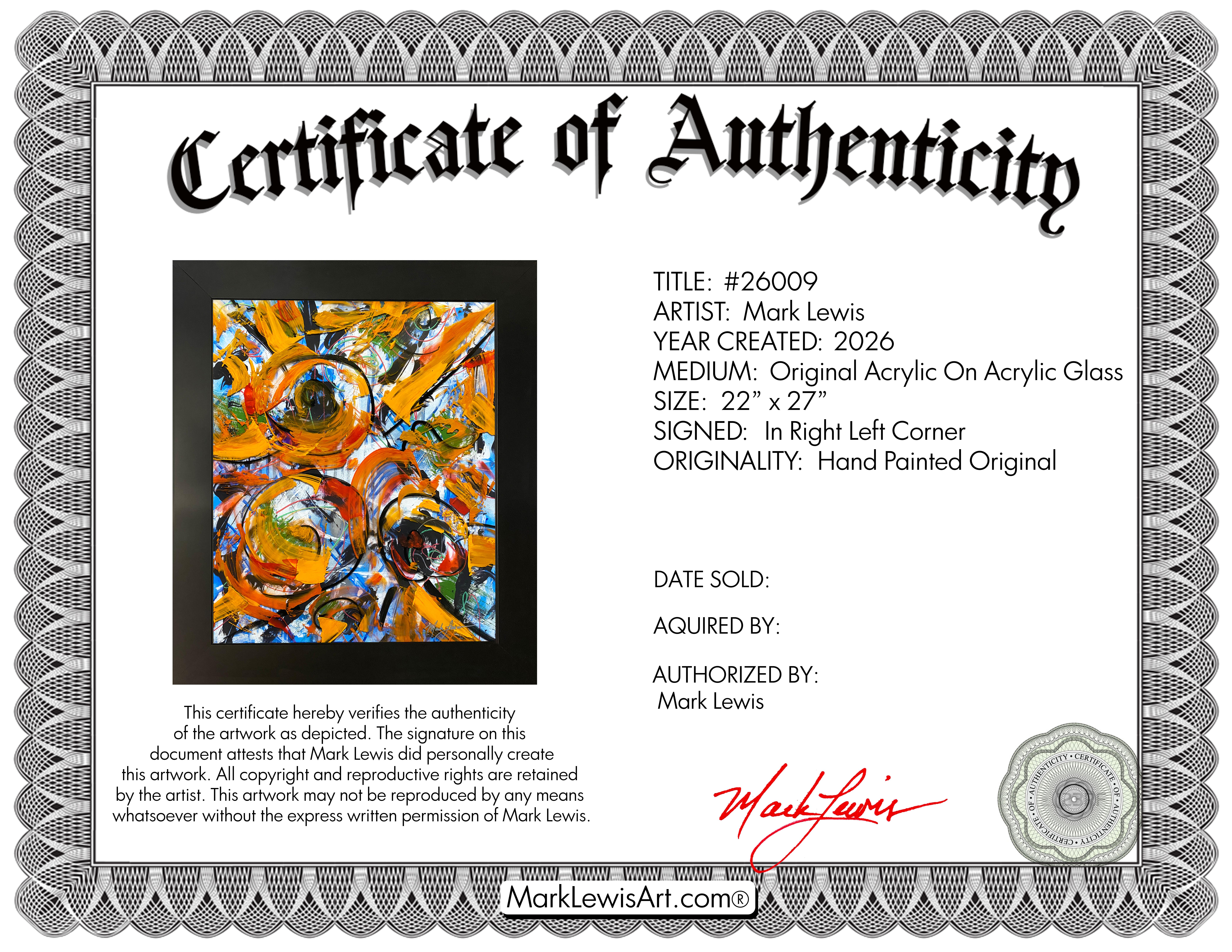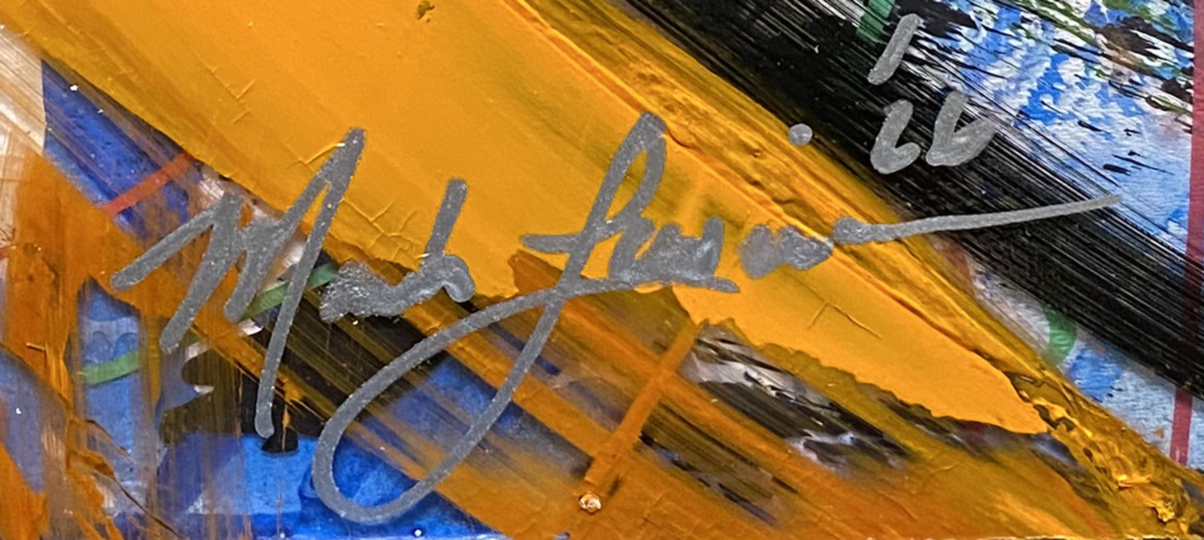 Evaluation: A vivid explosion of modern abstract expressionism, this work radiates with a sun drenched and electric palette. Created by Mark Lewis the great grand nephew of MLB legend Cy Young the piece features a heavy layering of golden amber, fiery tangerine, and sky blue accents. Swirling circular motions and bold impasto strokes create a sense of celestial motion while thin scribbled lines provide a sharp and frantic contrast. Painted directly onto premium acrylic glass, the work achieves a luminous 3D depth where the warm pigments appear to float over a bright background. It is a bold exploration of light and heat bridging a storied American lineage with contemporary pop energy.