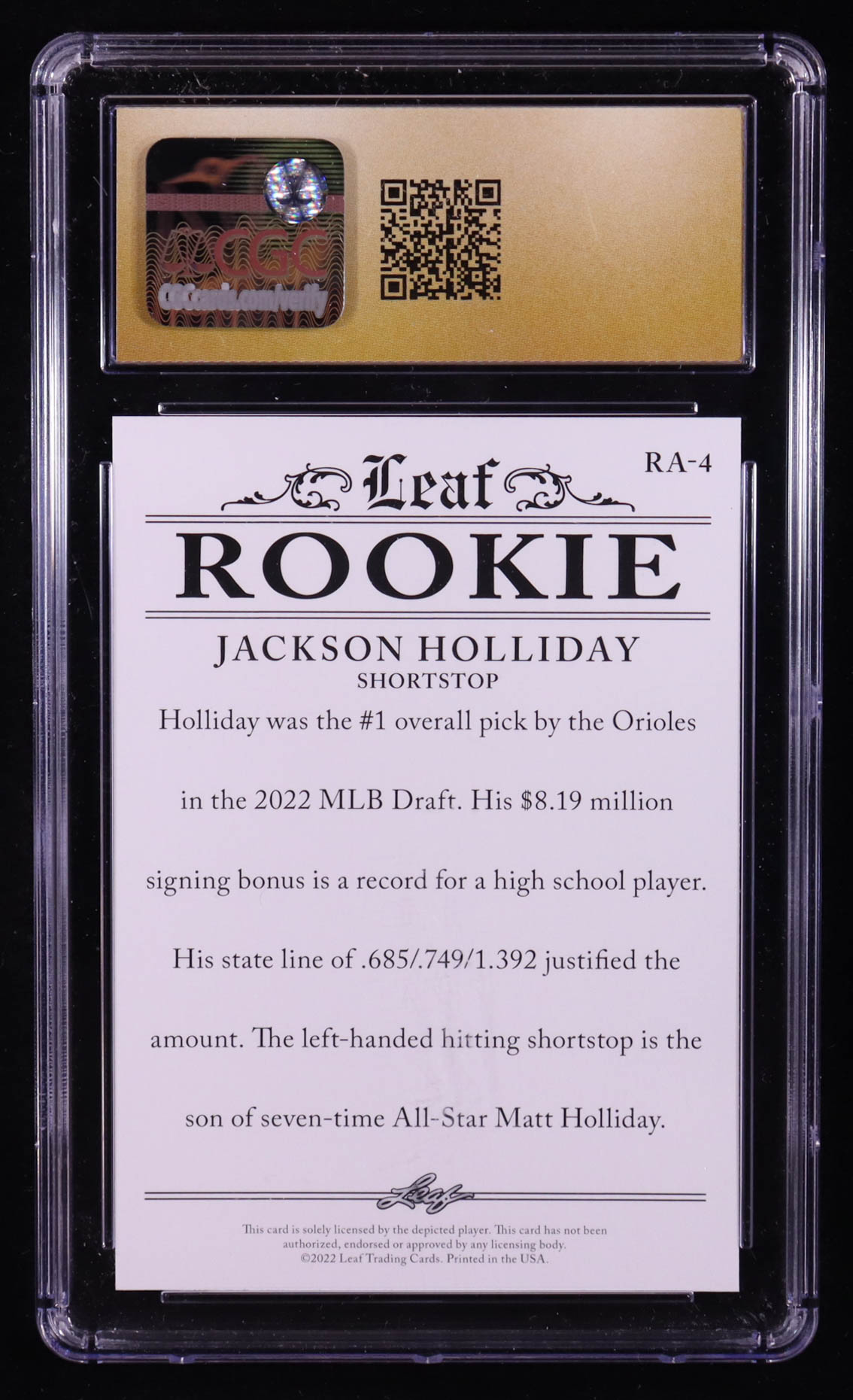 Jackson Holliday 2022 Leaf Rookie Achievement #RA-4 RC (CGC 10 Pristine)