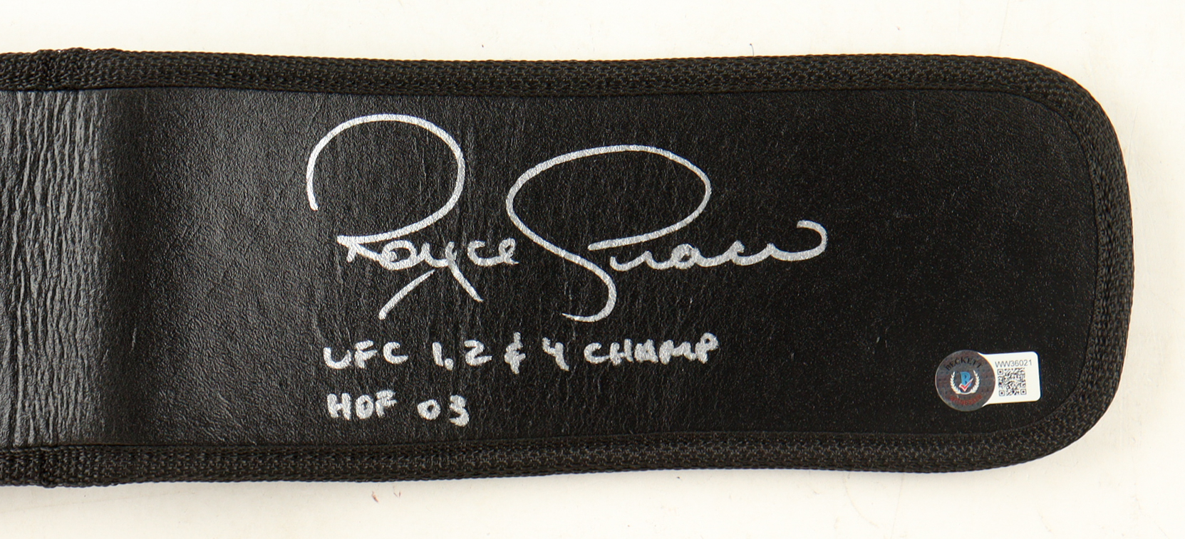 The belt is hand-signed and inscribed by UFC legend, Royce Gracie.