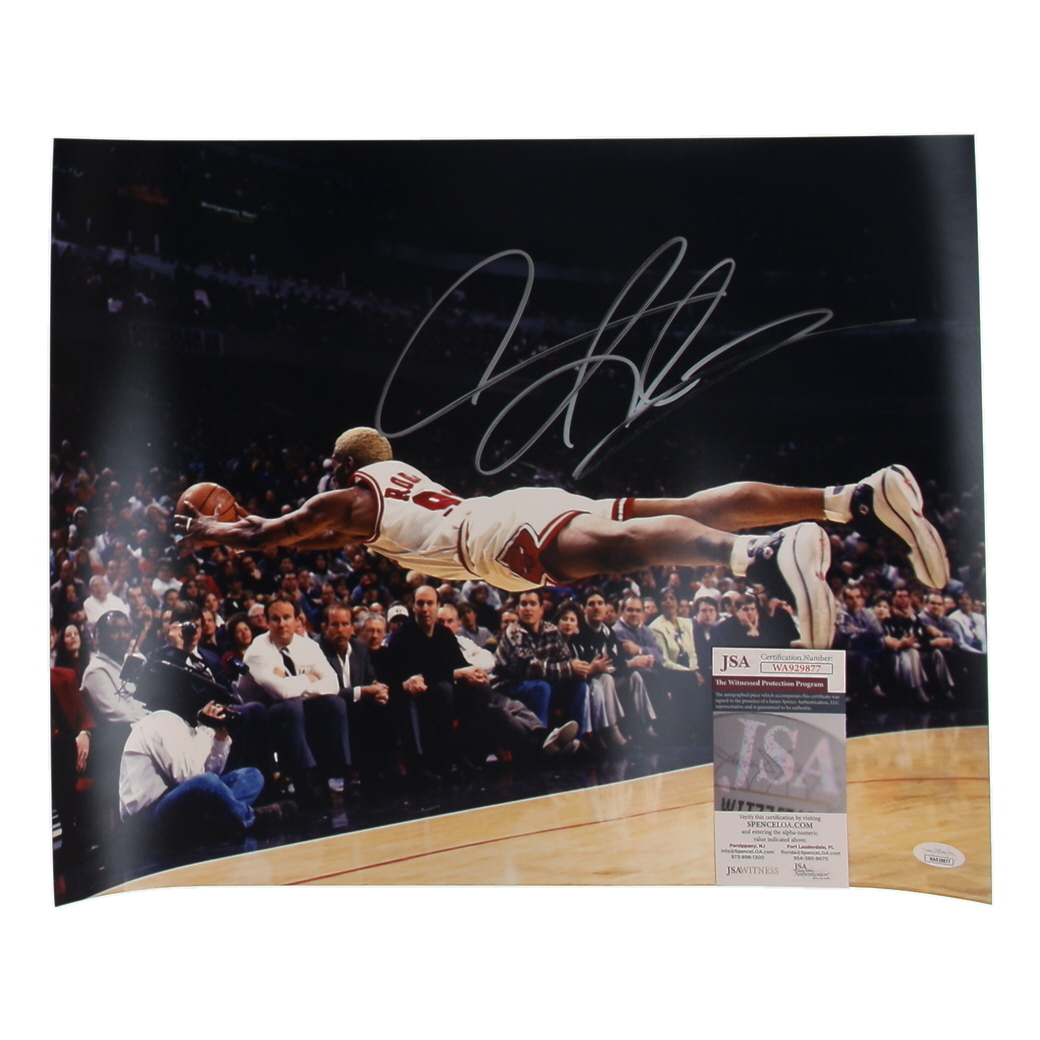 Photo measures 16” x 20” in size and has been hand-signed by Dennis Rodman (Chicago Bulls, HOF).