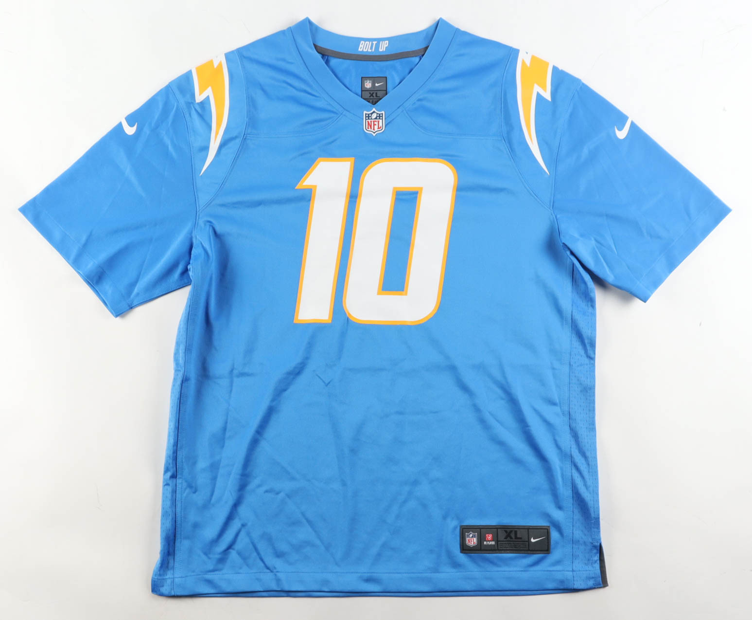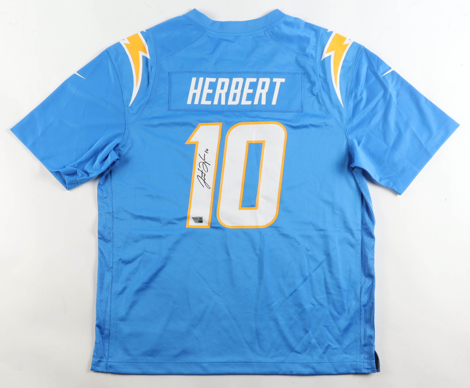 Nike jersey with everything pressed on, size XL. Hand-signed by Justin Herbert (Los Angeles Chargers).