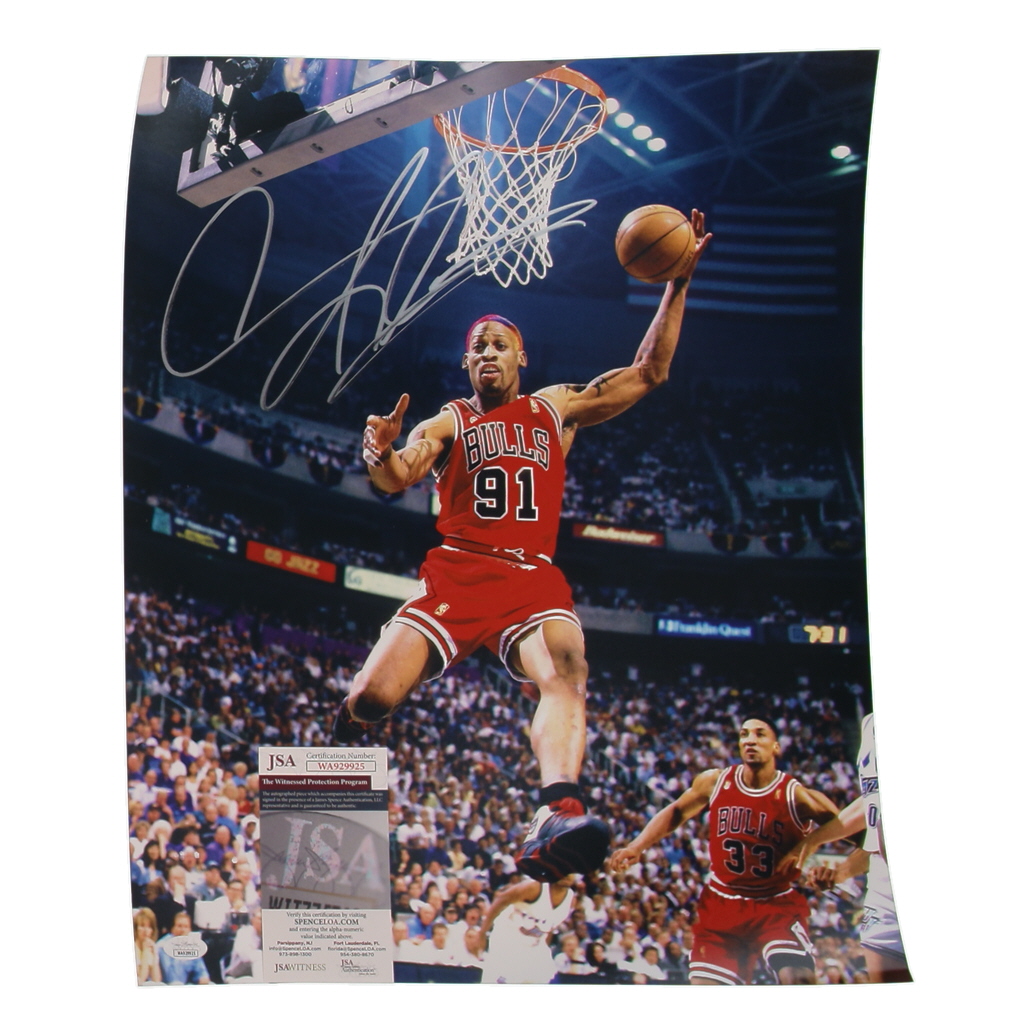 Photo measures 16” x 20” in size and has been hand-signed by Dennis Rodman (Chicago Bulls, HOF).