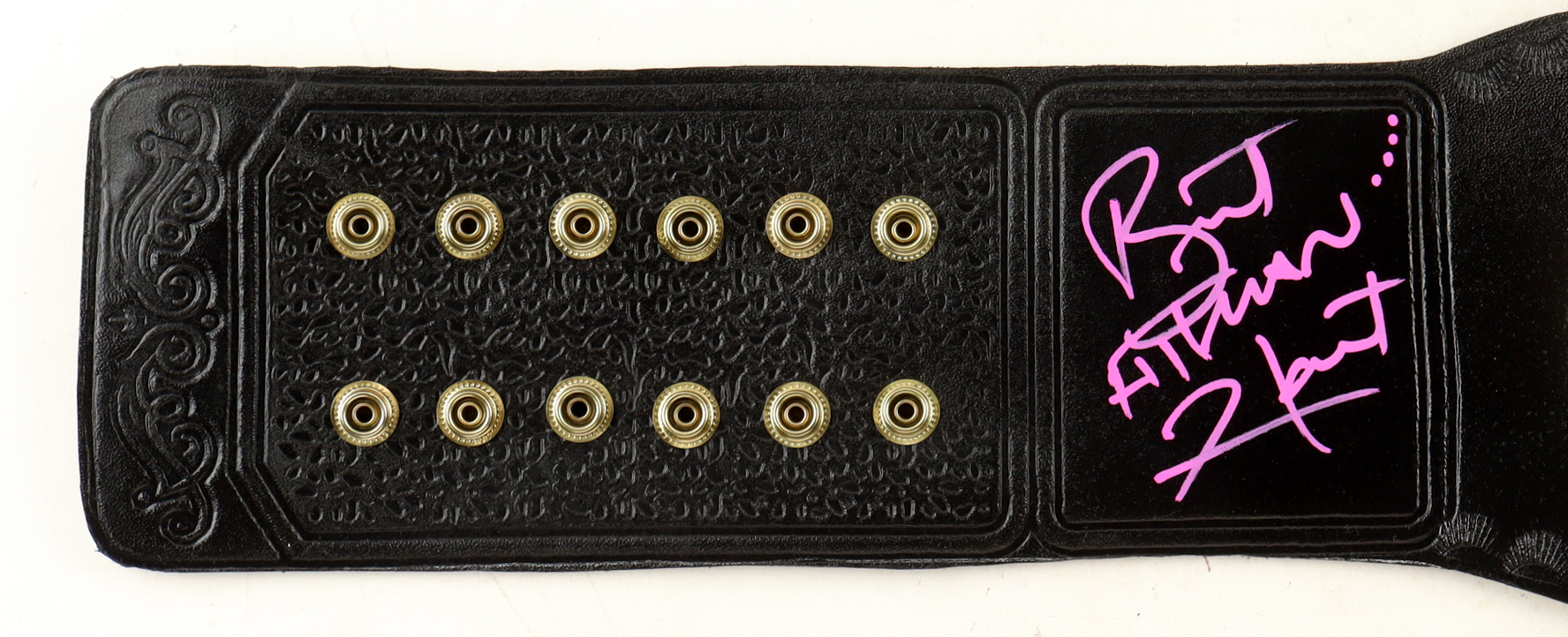 Replica WWE World World Championship wrestling belt measures approximately 49" in length and has been hand-signed by Bret "Hitman" Hart (HOF). Please see photos for more details on the condition of the belt and signature.