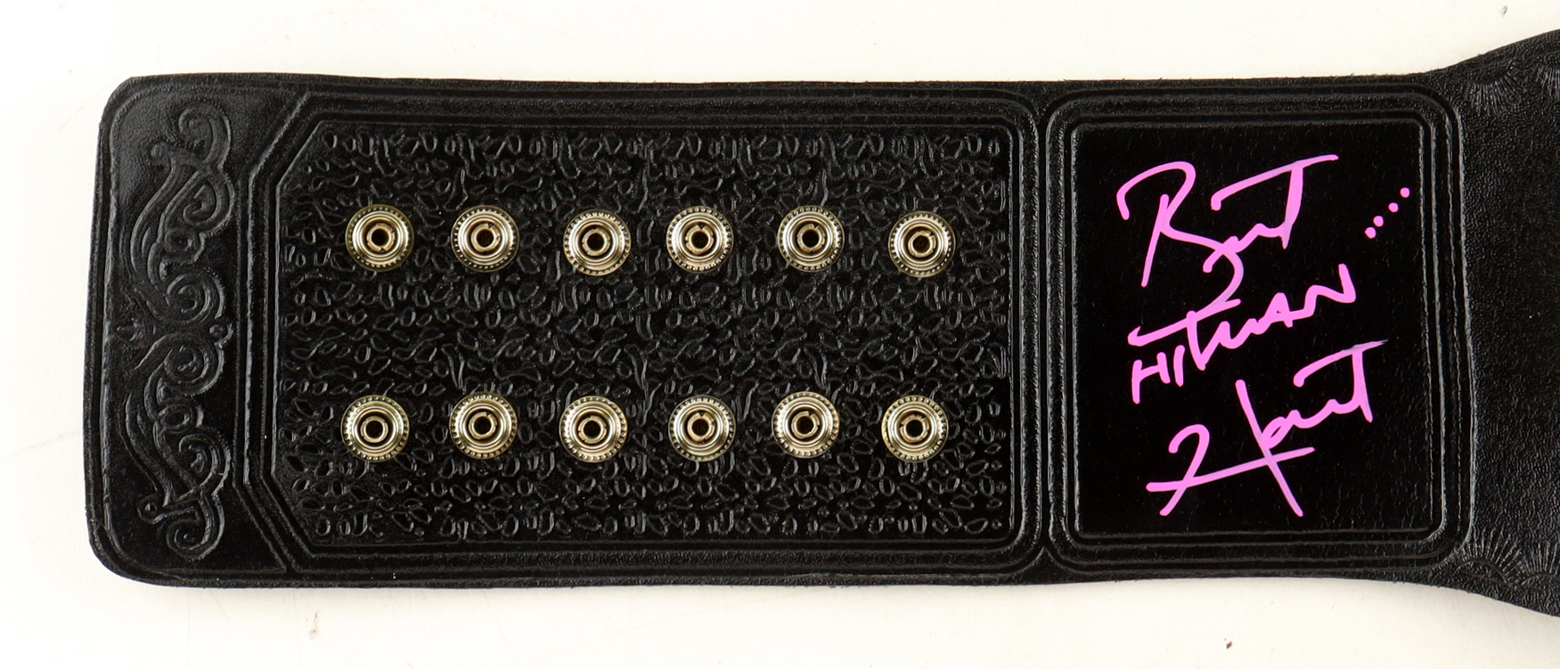 Replica WWE World World Championship wrestling belt measures approximately 49" in length and has been hand-signed by Bret "Hitman" Hart (HOF). Please see photos for more details on the condition of the belt and signature.