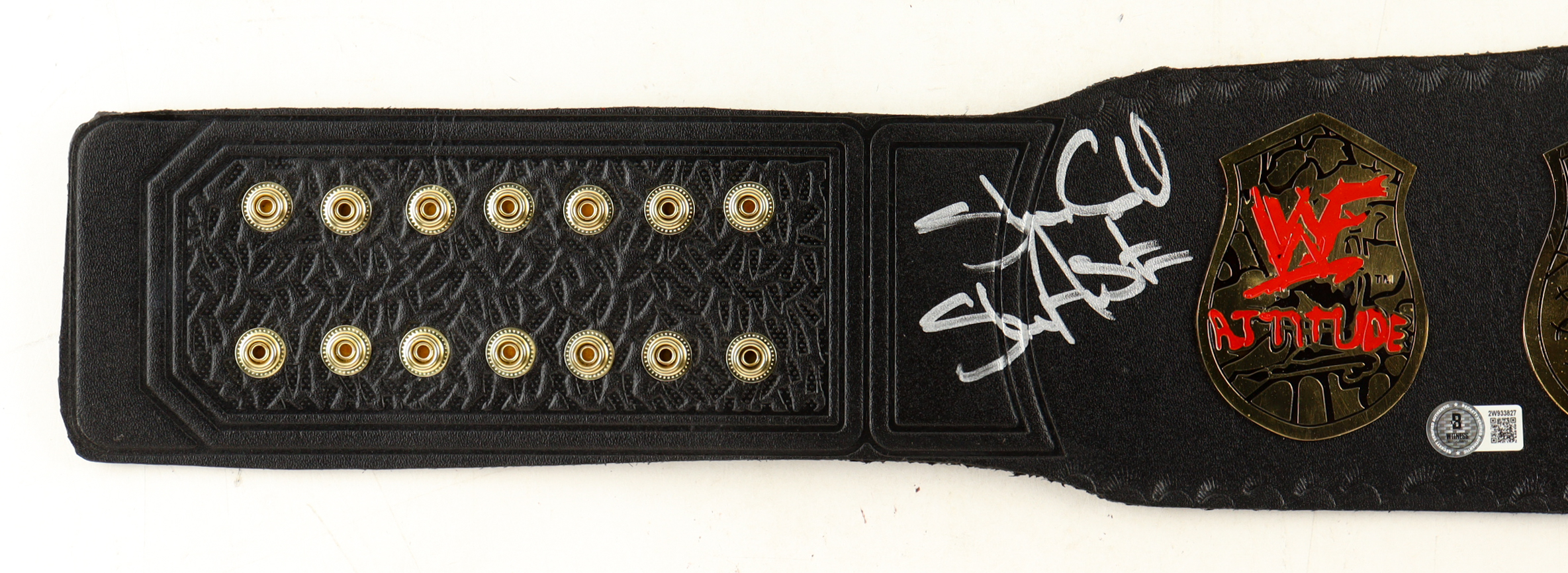 Full-Size Belt measures approximately 52" in length and has been hand-signed by Steve Austin (HOF). Please see photos for details regarding the condition of the belt.