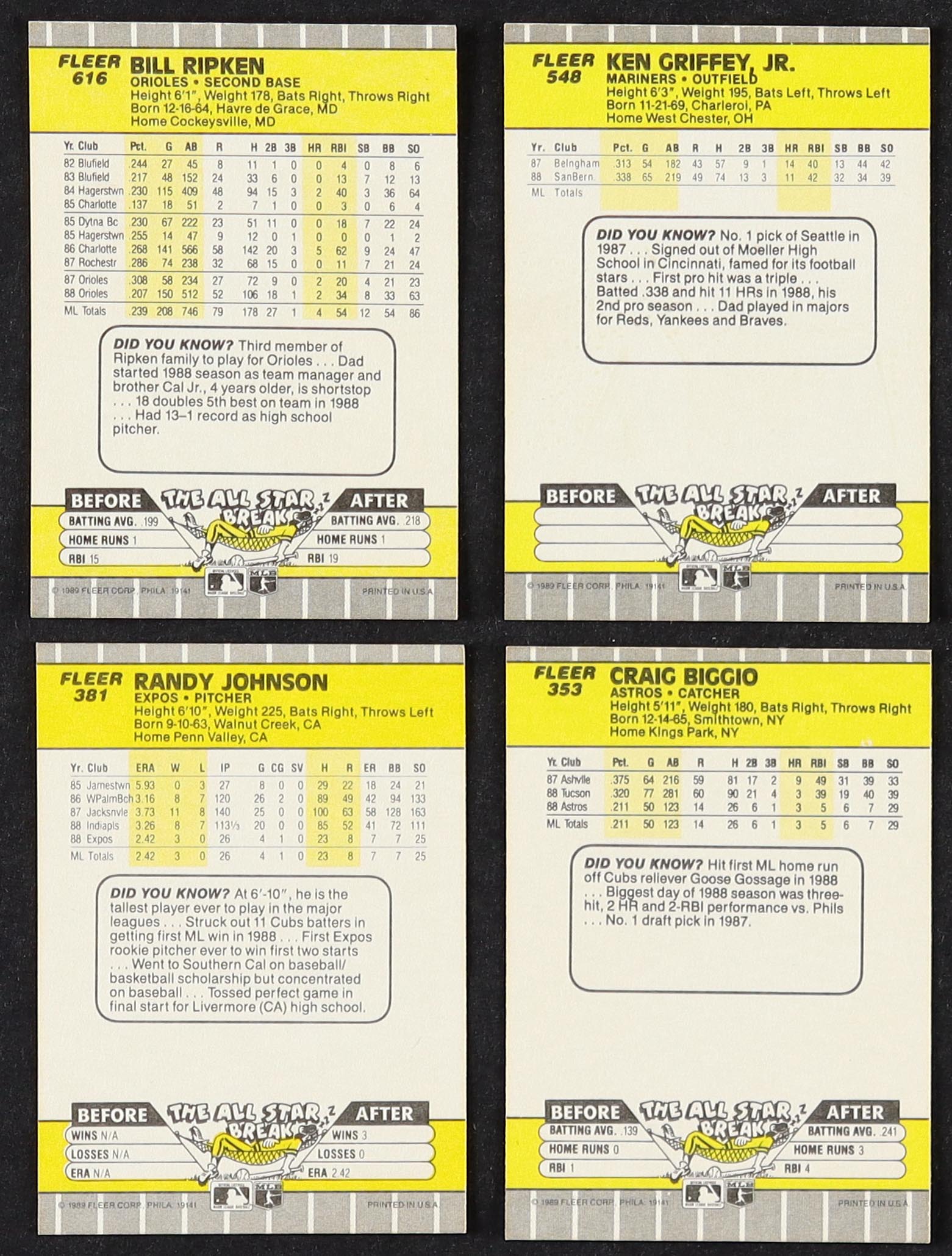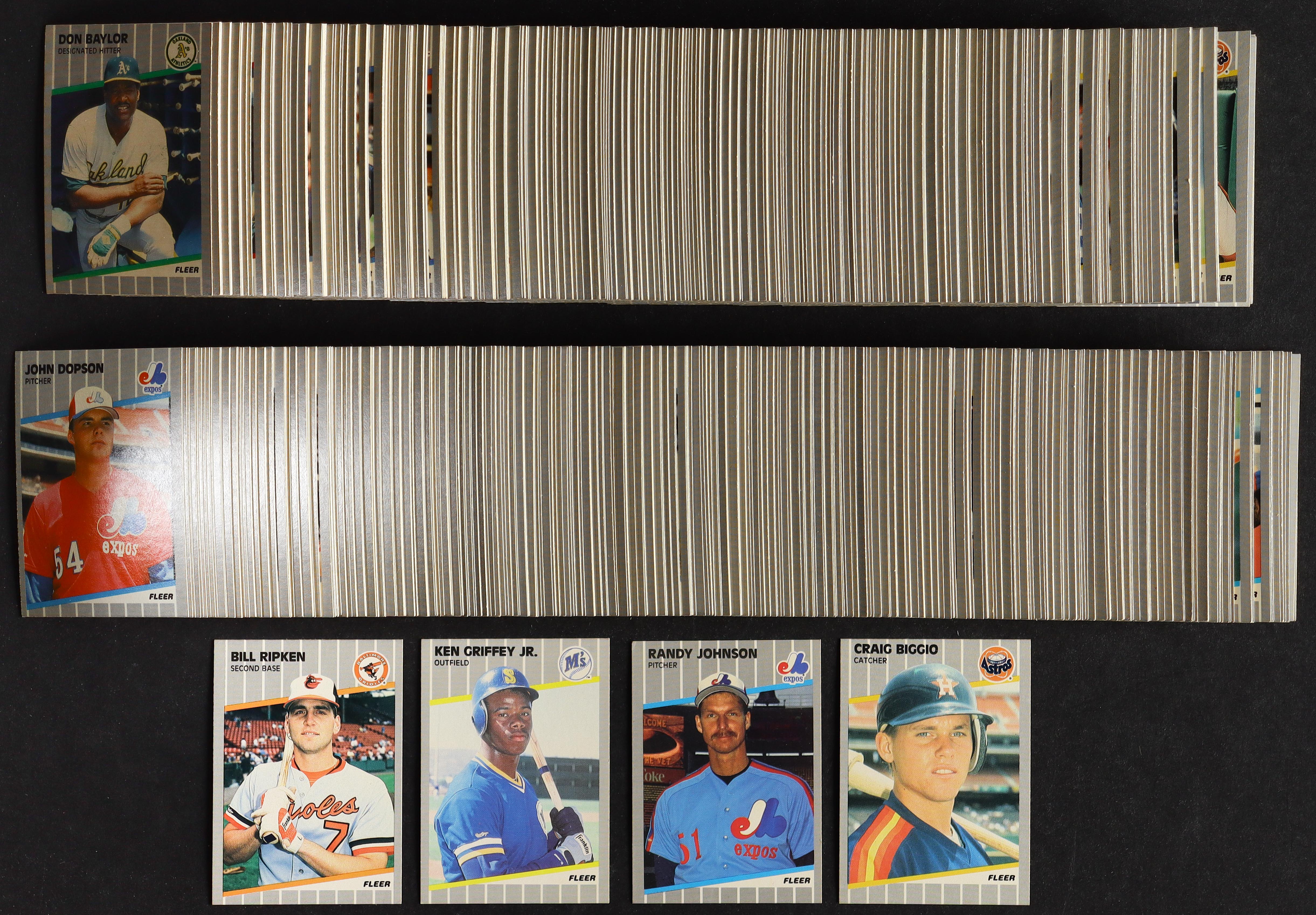 1989 Fleer Complete Set of (660) Baseball Cards with Craig Biggio #353 RC, Ken Griffey Jr. #548 RC, Randy Johnson #381 RC, Bill Ripken #616