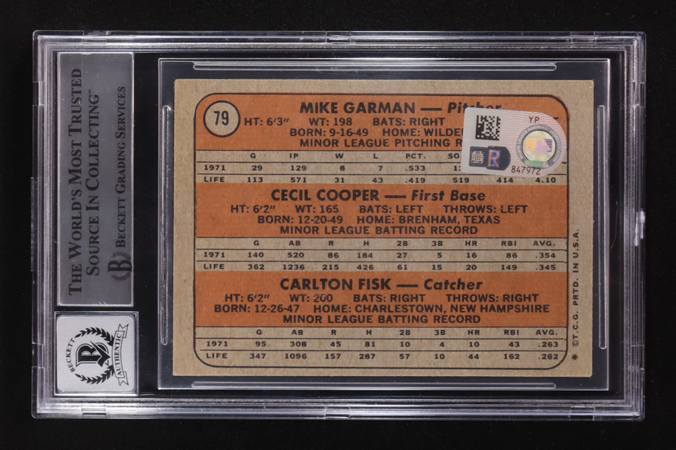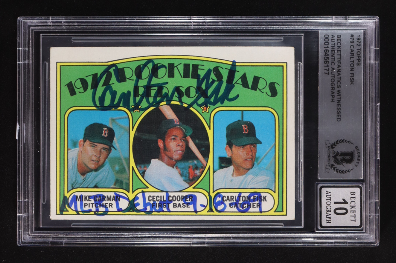 Carlton Fisk / Mike Garman / Cecil Cooper Signed 1972 Topps Rookie Stars Inscribed "MLB Debut 9-18-69" #79 RC (BGS | Autograph Graded BGS 10)