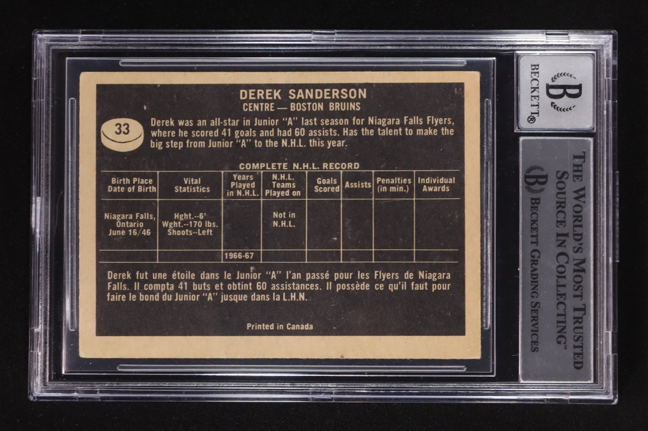 Derek Sanderson Signed 1967-68 Topps Inscribed "ROY 67-68 , SCC 1970-71" #33 RC (BGS | Autograph Graded BGS 10)