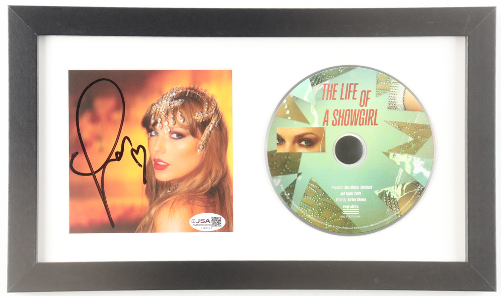 Custom frame measures approximately 8" x 13" in size. Features a "The Life of a Showgirl" CD insert that has been hand-signed by Taylor Swift. The display also includes the disc as shown.
