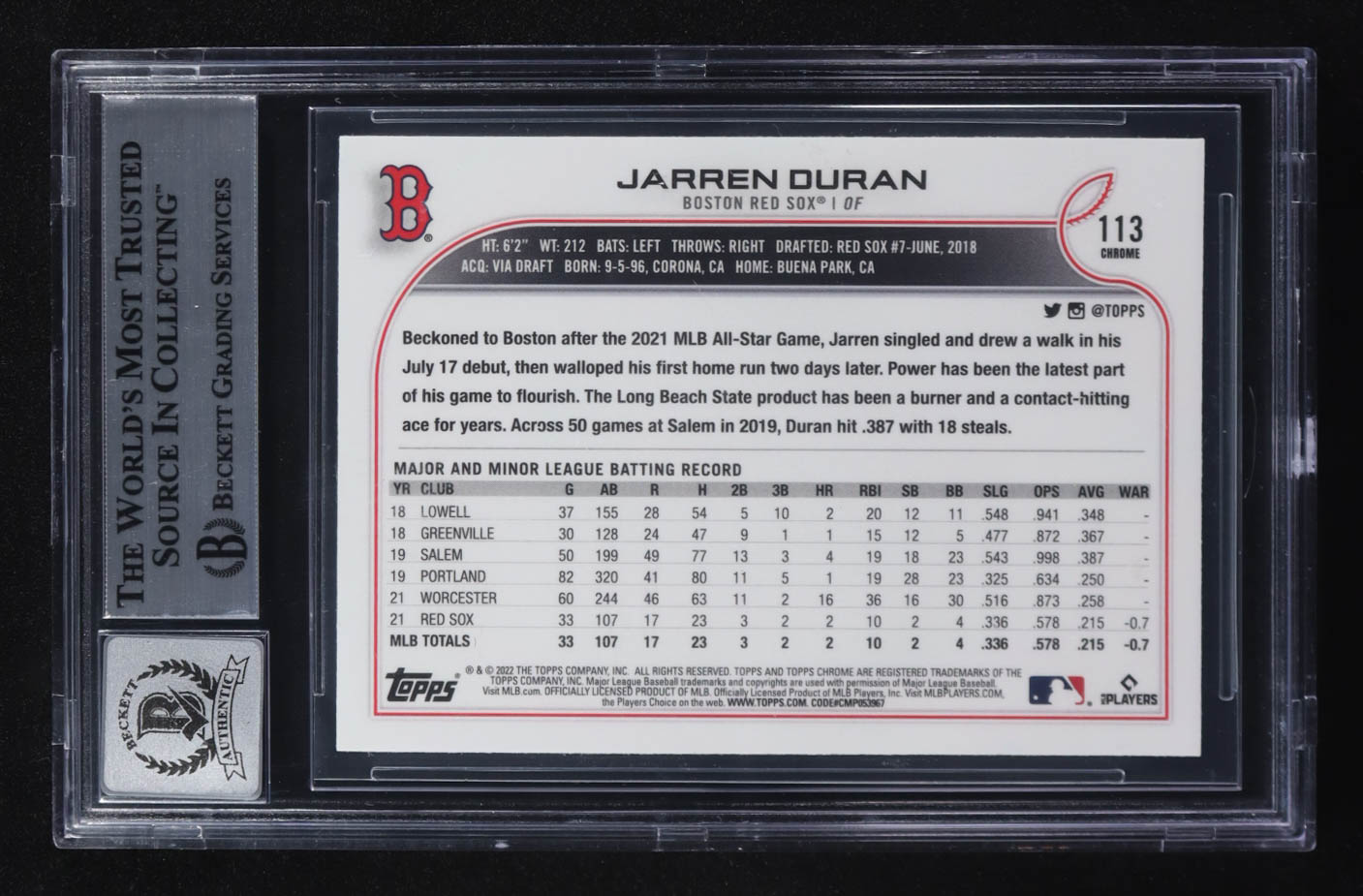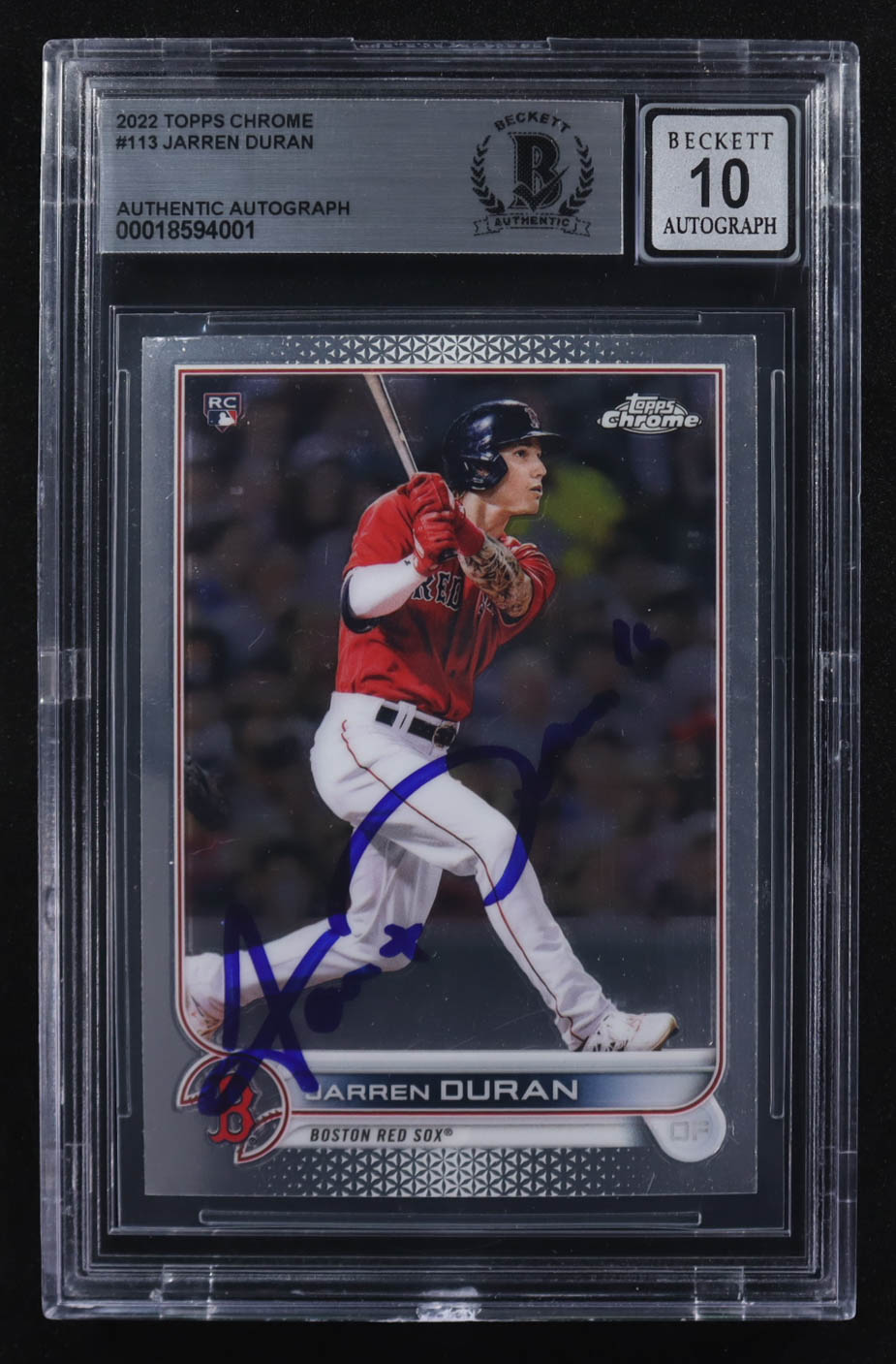 Jarren Duran Signed 2022 Topps Chrome #113 RC (BGS | Autograph Graded BGS 10)