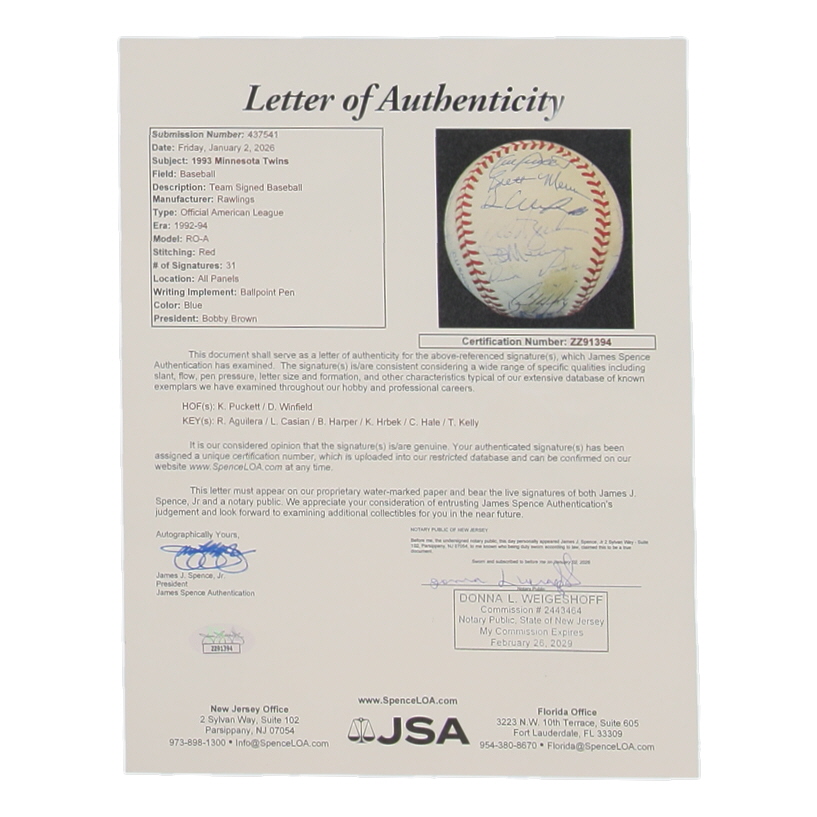 1993 Minnesota Twins | OAL Baseball Hand-Signed by (31) with Kirby Puckett, Dave Winfield, Larry Casian, Brian Harper (JSA)