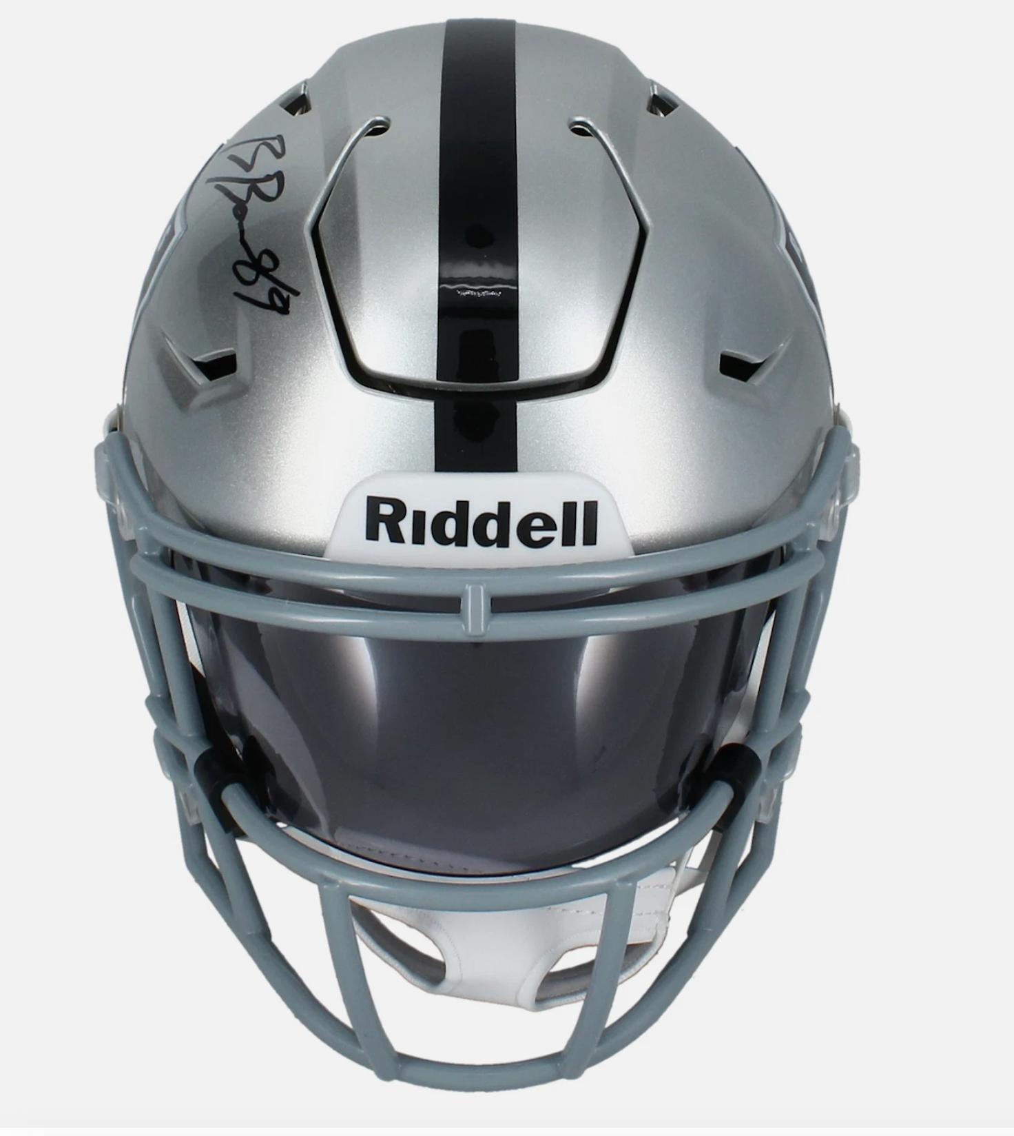 Riddell Las Vegas Raiders mid-size speedflex helmet has been hand-signed by Brock Bowers.