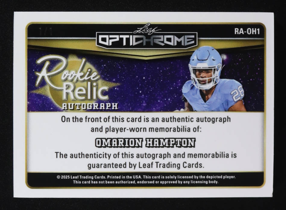 Omarion Hampton 2025 Leaf Optichrome Metal Rookie Relic Autographs Prismatic Gold #RAOH1 #1/1 RC