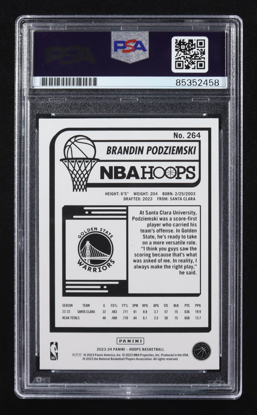 Brandin Podziemski Signed 2023-24 Panini NBA Hoops #264 RC (PSA)