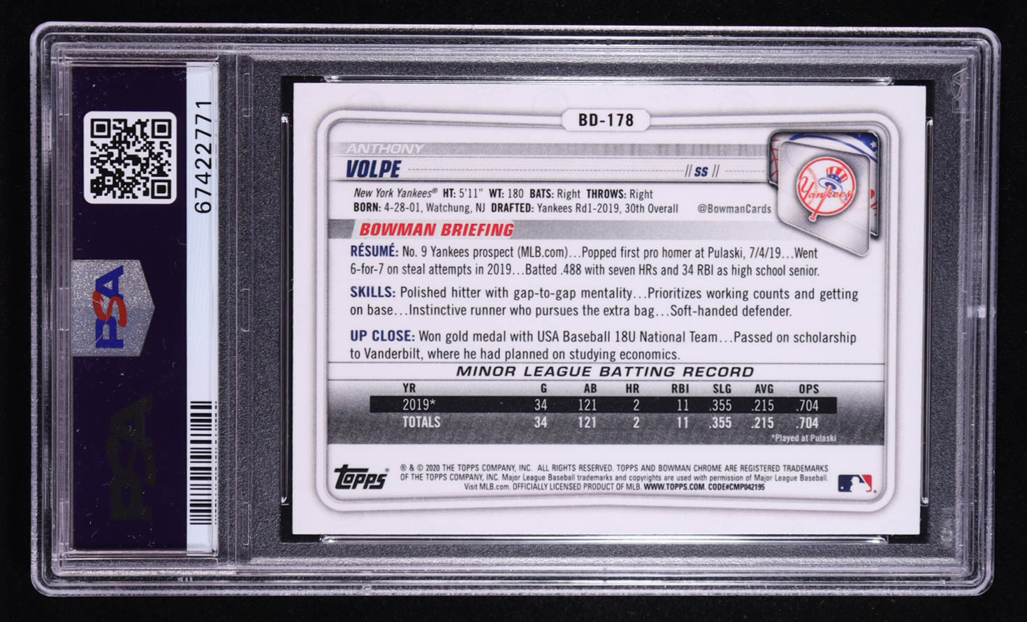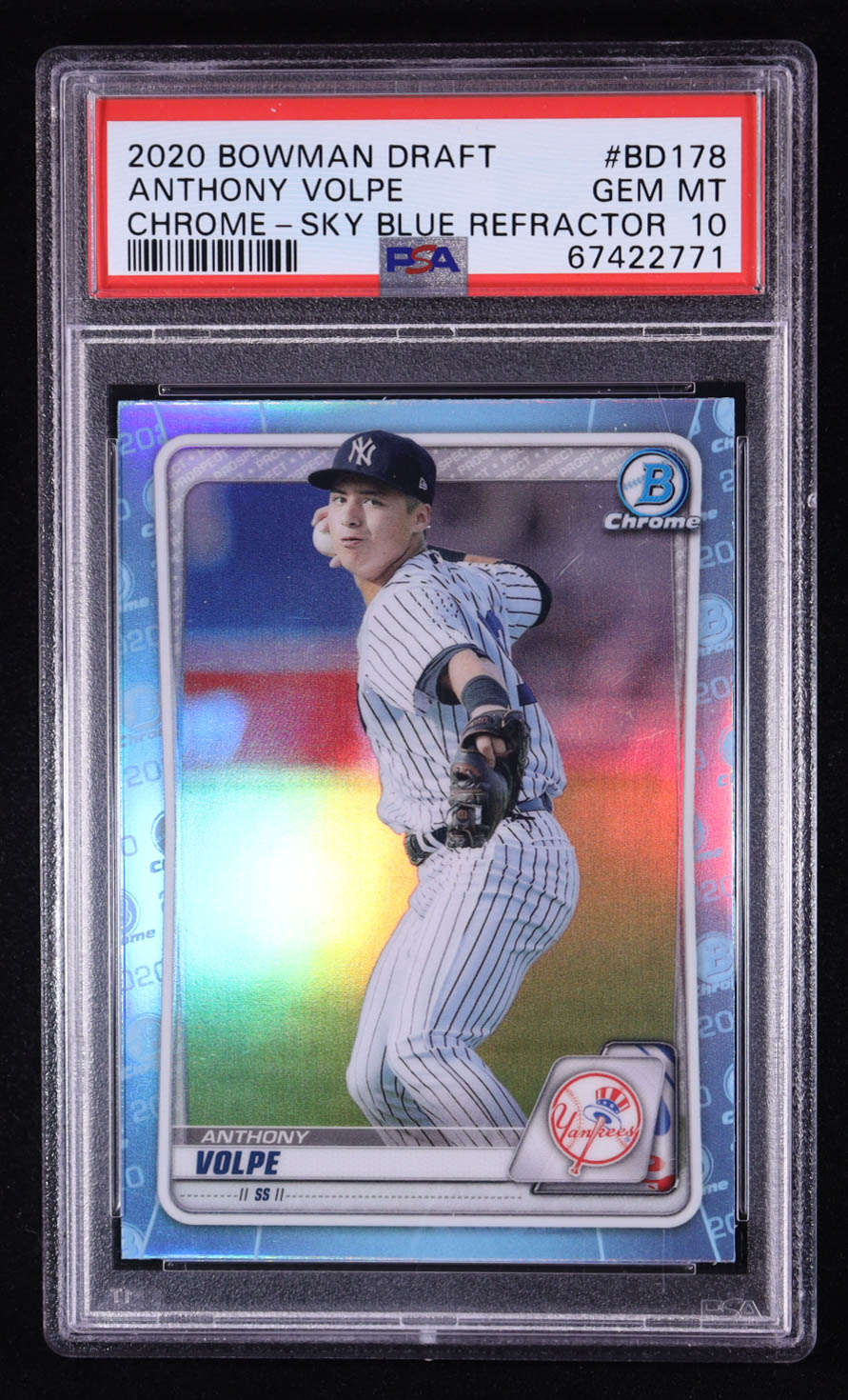 Anthony Volpe 2020 Bowman Draft Chrome Sky Blue Refractor #BD-178 RC (PSA 10)