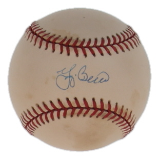 Custom frame measures approximately 16" x 20" x 4" in size and features a photo and Rawlings Official American League Baseball hand-signed by Yogi Berra (D. 2015, HOF). Please note the vintage Spalding baseball glove is unsigned and the display is scuffed.