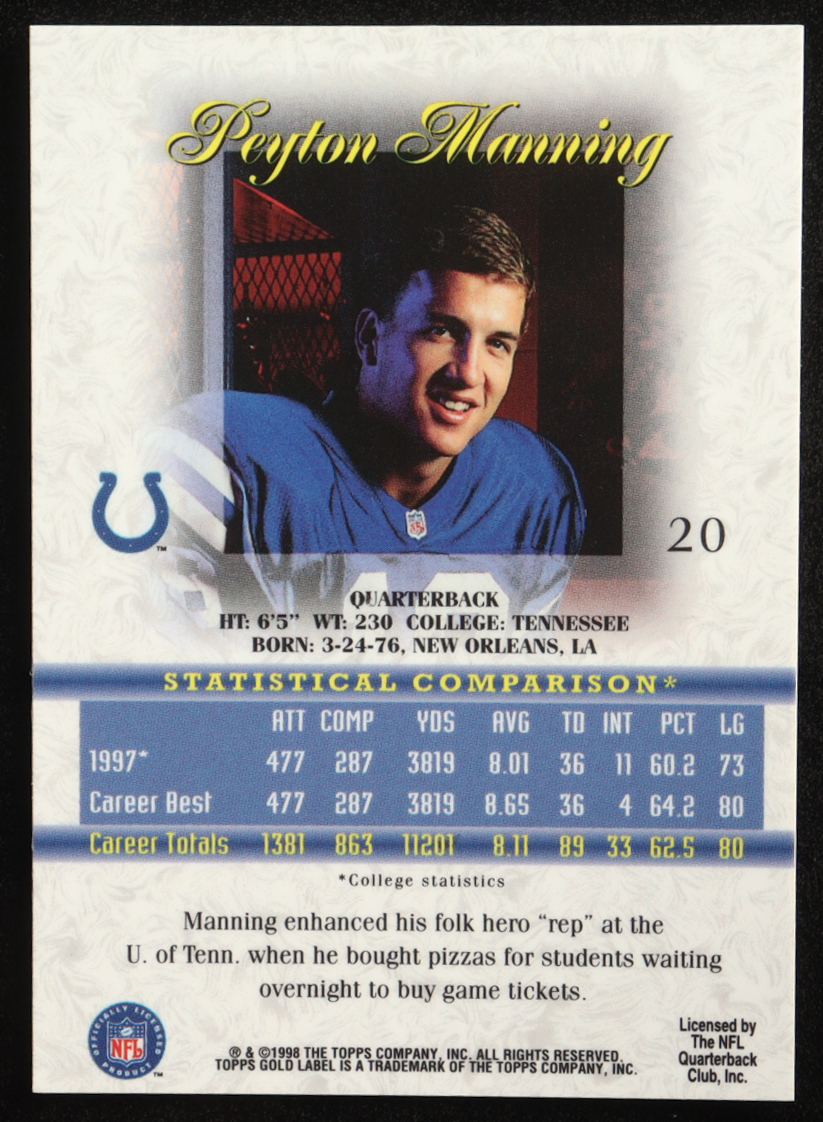 Peyton Manning 1998 Topps Gold Label Class 1 #20 RC
