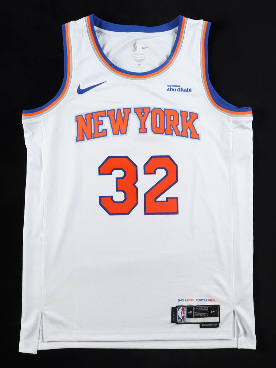 Nike authentic jersey with everything pressed on, size 48. Hand-signed by Karl-Anthony Towns (New York Knicks).