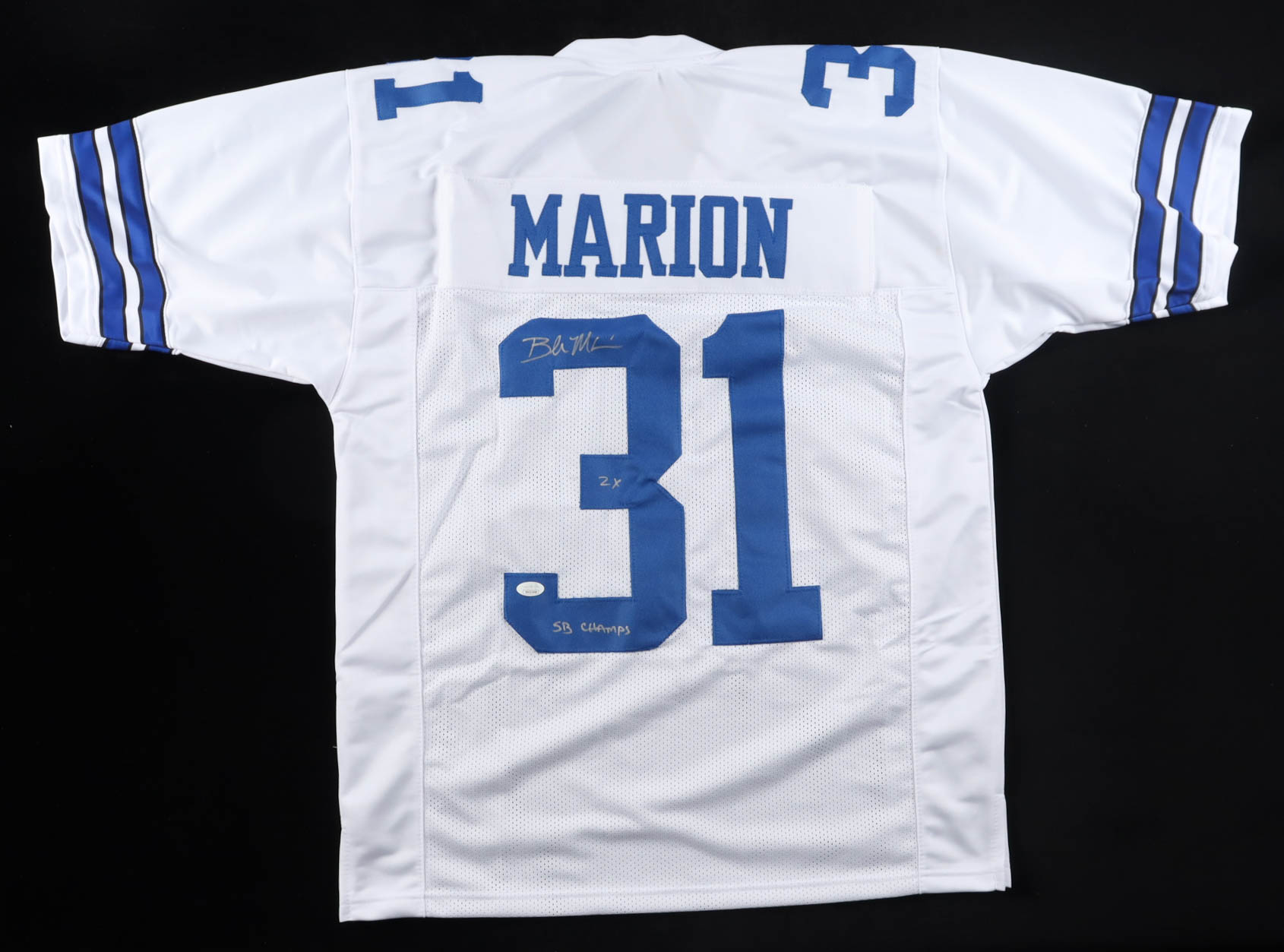 Custom jersey with everything sewn on, size XL. Hand-signed and inscribed by Brock Marion (Dallas Cowboys).
