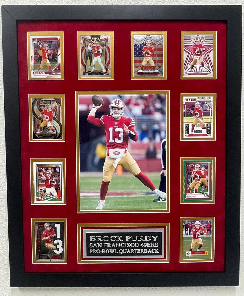 Custom frame measures approximately 20" x 24" in size and features an unsigned photo of Brock Purdy (San Francisco 49ers). Professionally designed and framed, this piece features a vibrant 8x10 action photo of Brock Purdy surrounded by a curated selection of trading cards (cards will vary), all mounted on premium team-colored matting with striking accents.