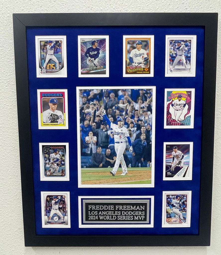 Custom frame measures approximately 20" x 24" in size and features an unsigned photo of Freddie Freeman (Los Angeles Dodgers). Professionally designed and framed, this piece features a vibrant 8x10 action photo of Freddie Freeman surrounded by a curated selection of trading cards (cards will vary), all mounted on premium team-colored matting with striking accents.