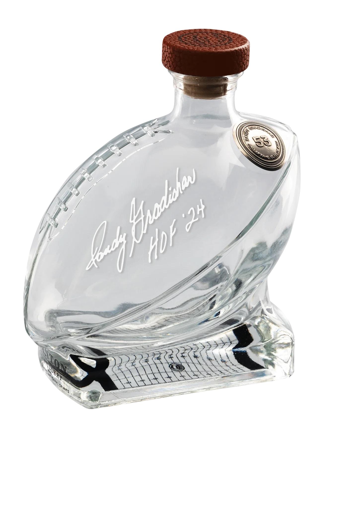 Custom Glass Cooperstown Canton Distillery 750ML Decanter commemorates Randy Gradishar (Denver Broncos, HOF). Please note, the signature is a facsimile and the glass features the Pro Football Hall of Fame logo.