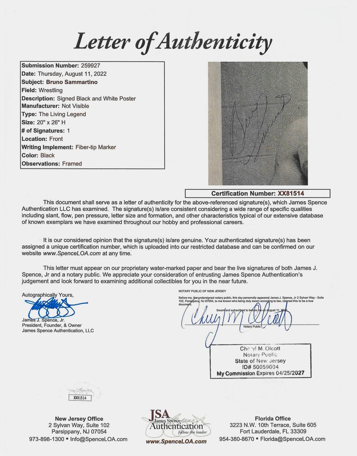 Photo measures 20" x 26" in size and has been hand-signed by Bruno Sammartino (D. 2018, HOF).