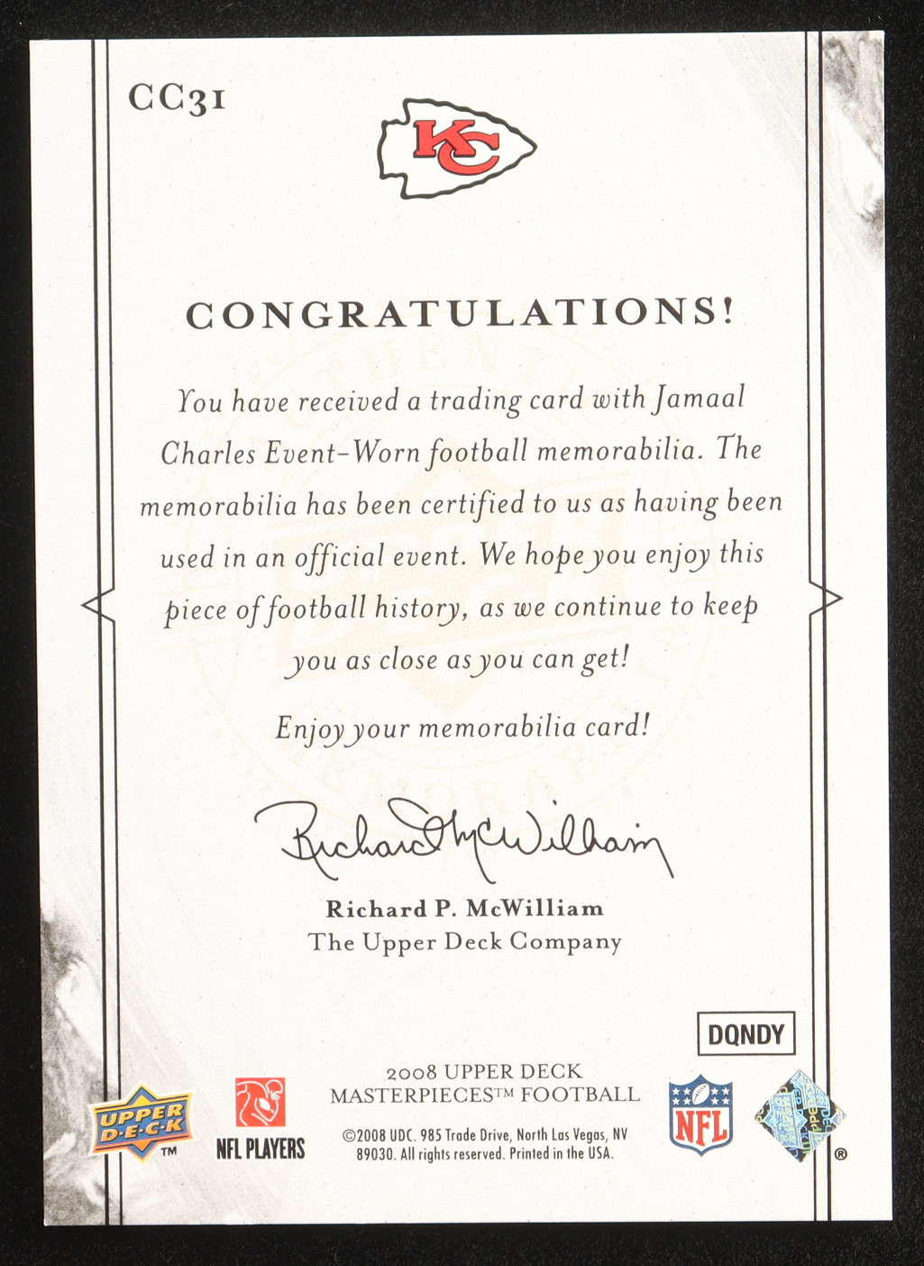 Jamaal Charles 2008 UD Masterpieces Captured on Canvas Jerseys #CC31 RC