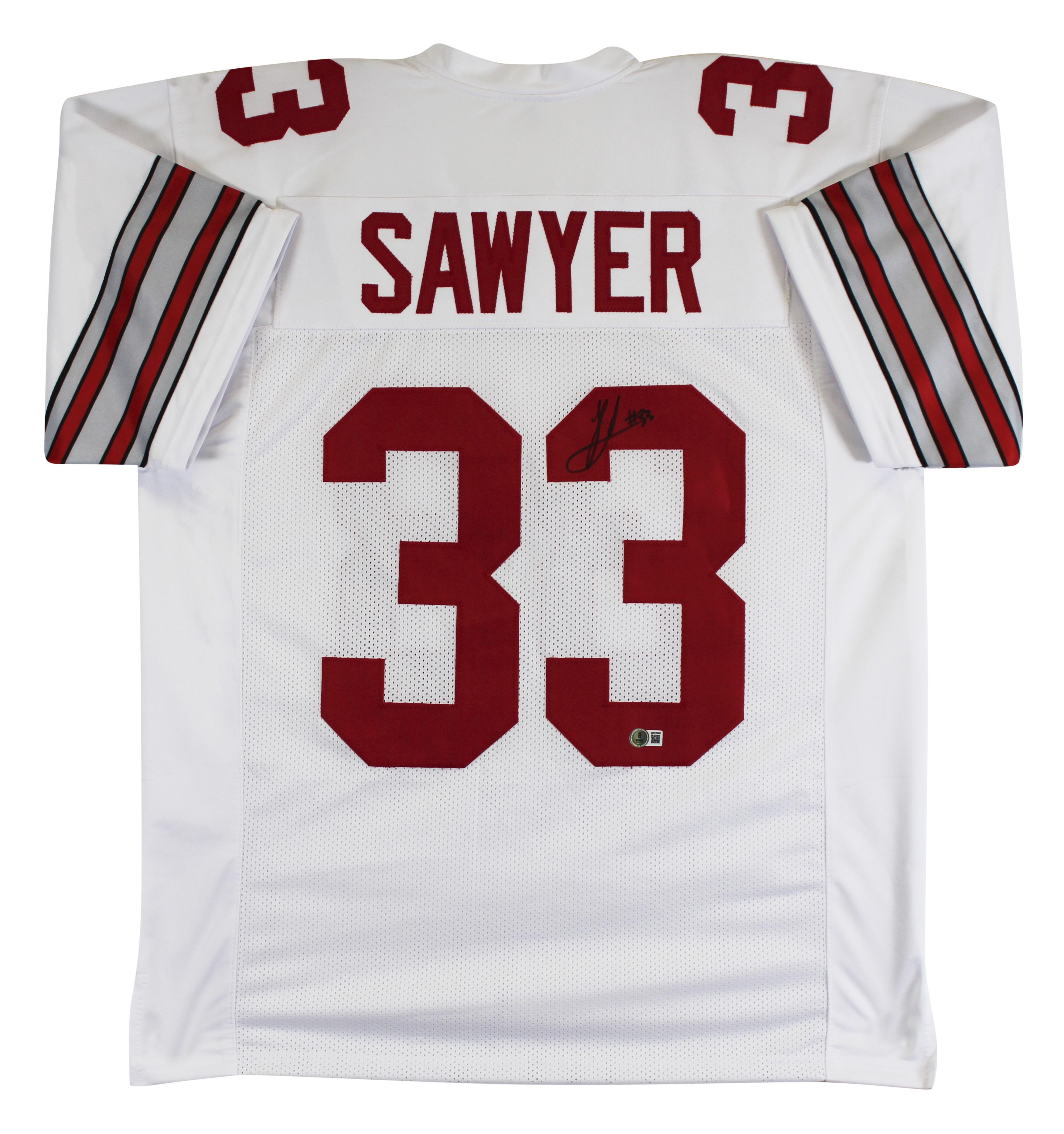 Custom jersey with everything sewn on, size XL. Hand-signed by Jack Sawyer (Ohio State Buckeyes).