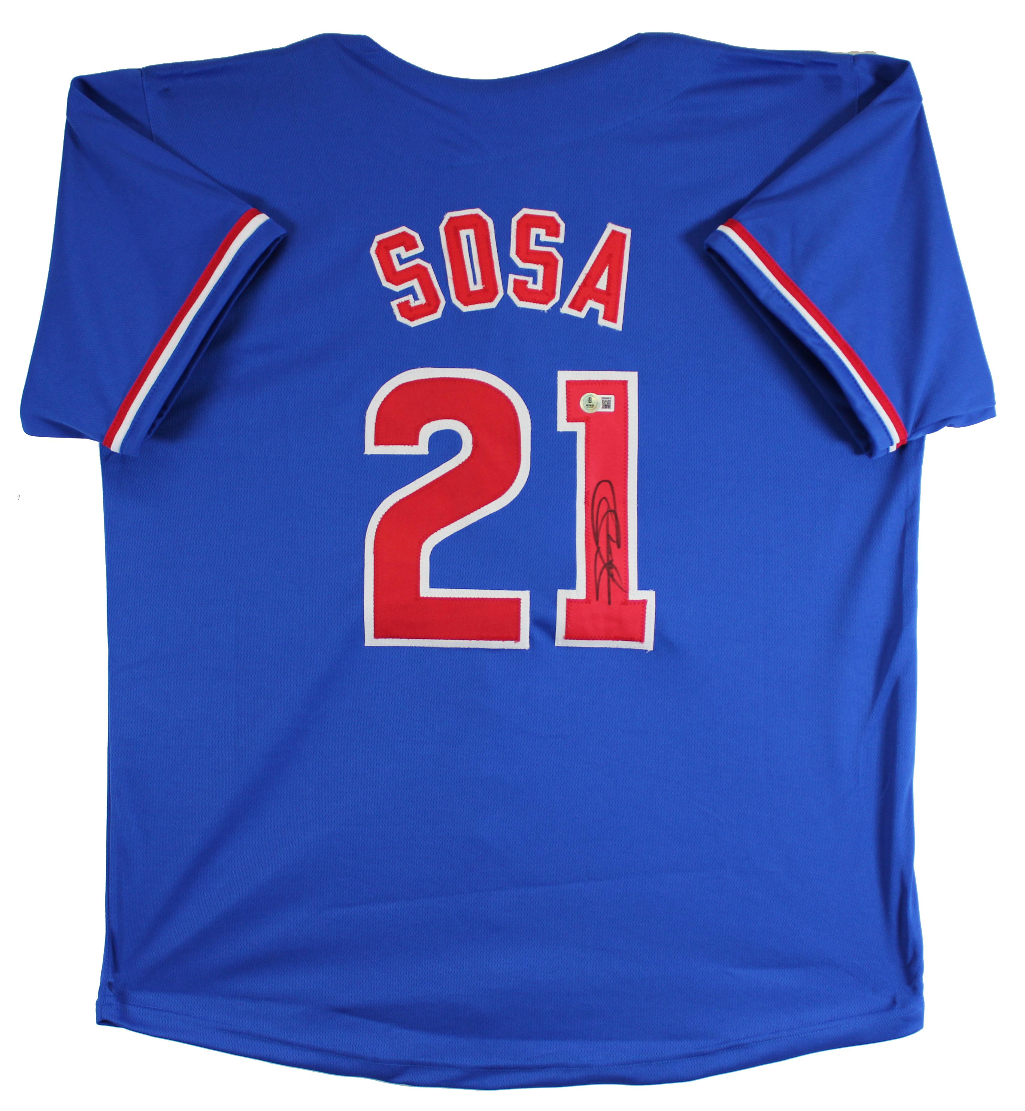 Custom jersey with everything sewn on, size XL. Hand-signed by Sammy Sosa (Chicago Cubs).