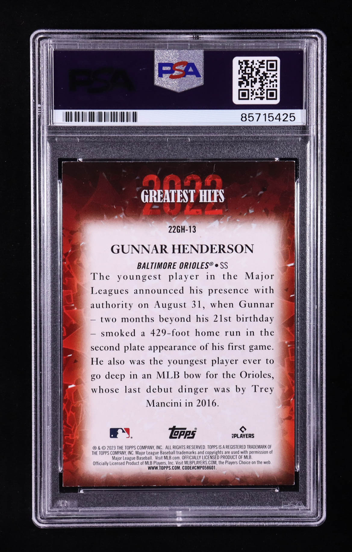 Gunnar Henderson Signed 2023 Topps Greatest Hits 2022 #22GH-13 RC (PSA | Autograph Graded PSA 10)