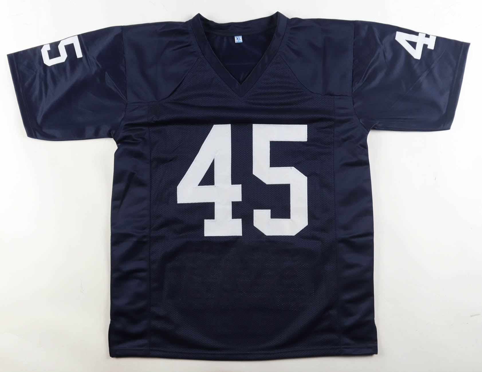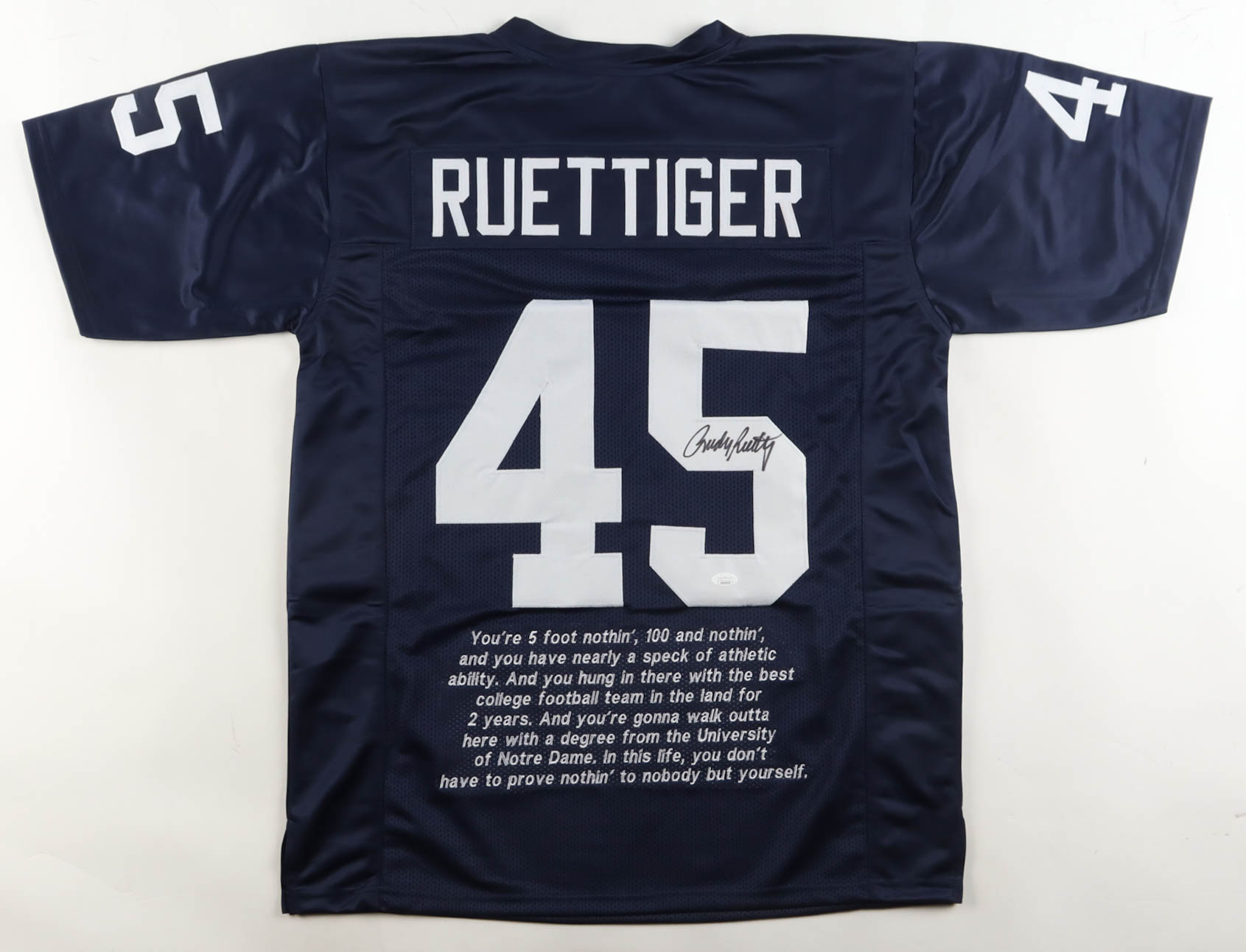 Custom jersey with everything sewn on, size XL. Hand-signed by Rudy Ruettiger (Notre Dame Fighting Irish). Please note, a quote from the movie "Rudy" has been custom-stitched below the reverse numbers.