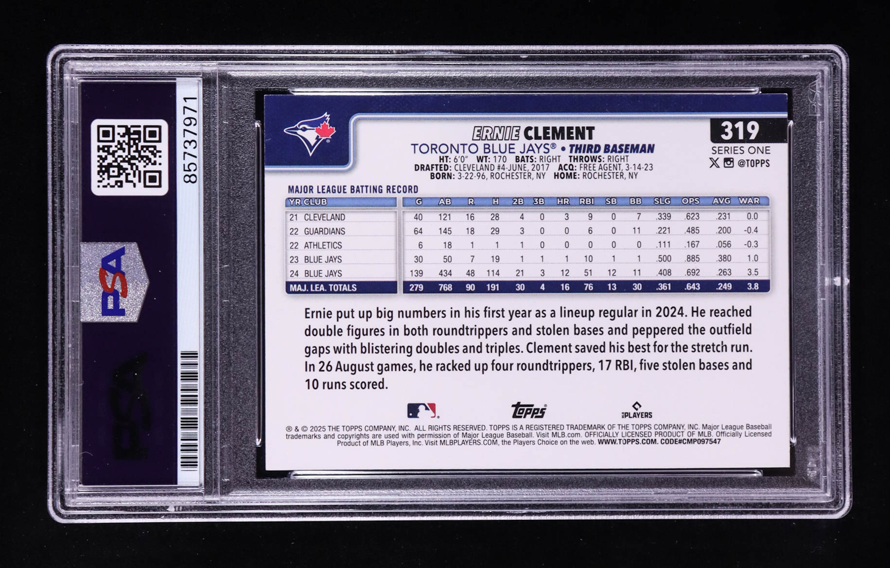 Ernie Clement Signed 2025 Topps Series One #319 (PSA | Autograph Graded PSA 10)
