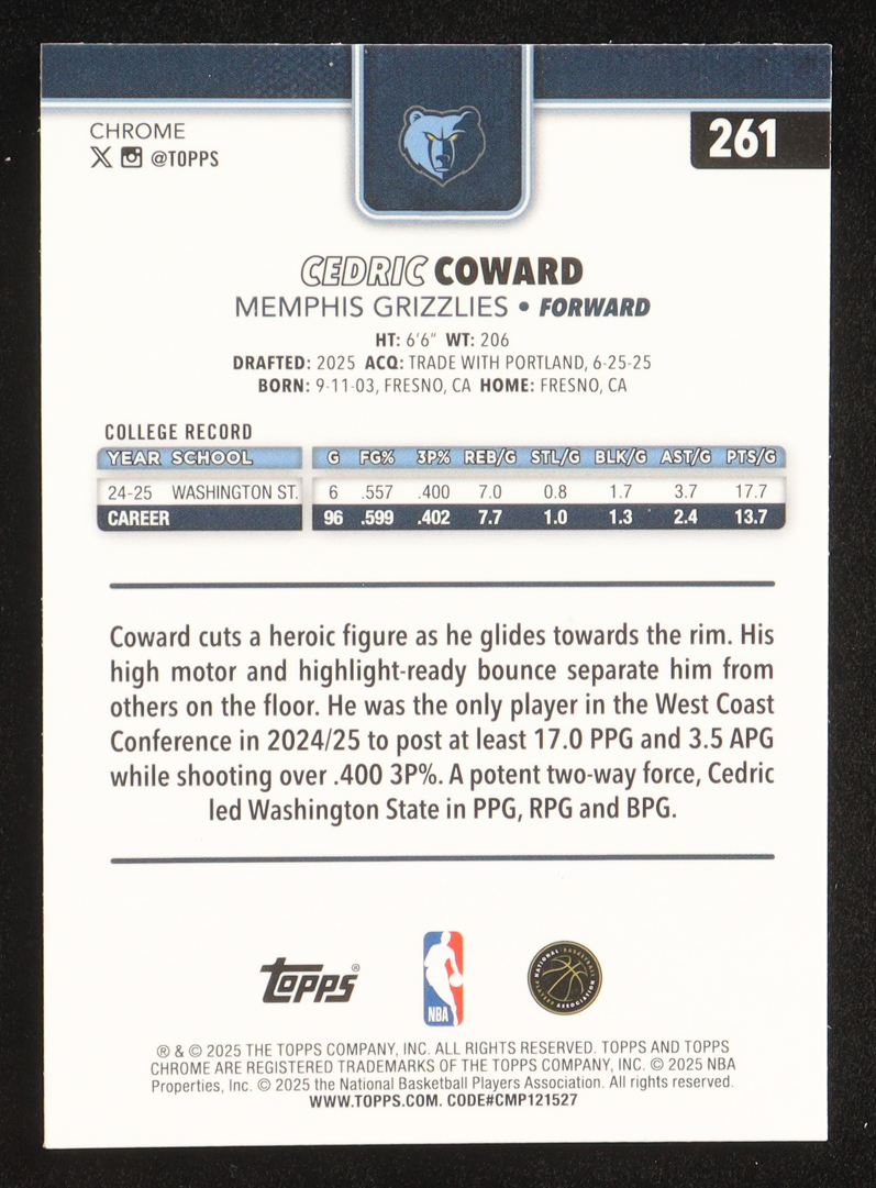 Cedric Coward 2025-26 Topps Chrome Refractors #261 RC