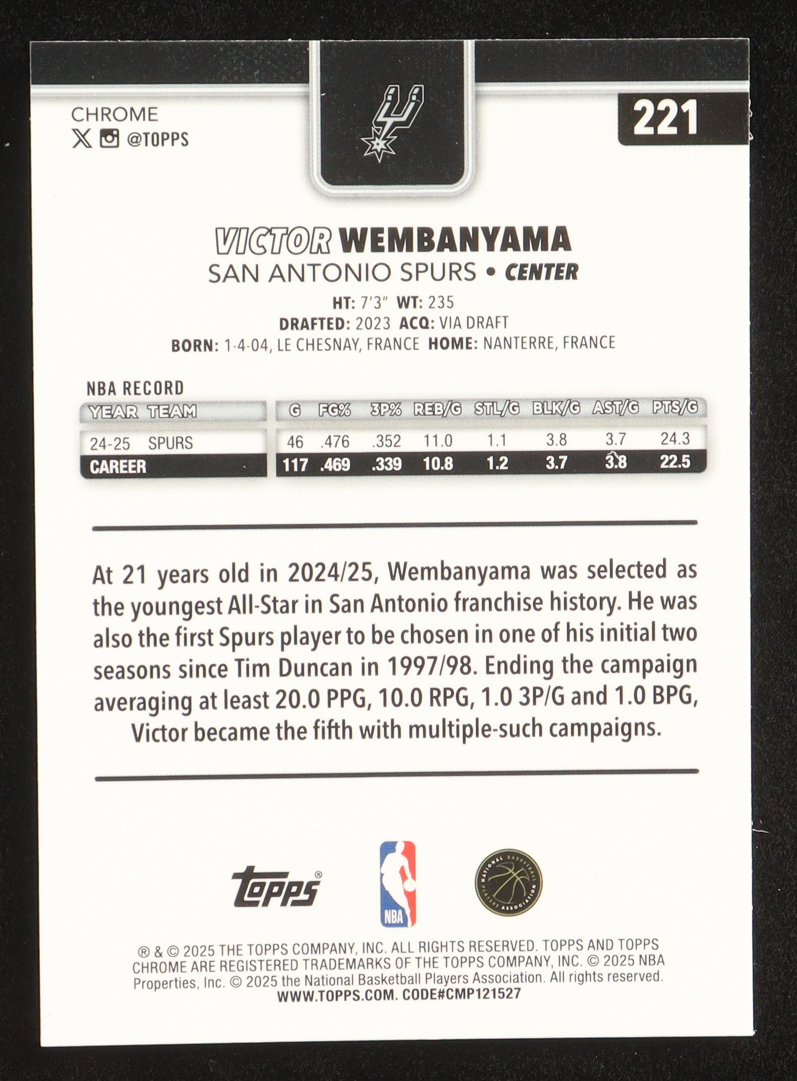 Victor Wembanyama 2025-26 Topps Chrome Refractors #221