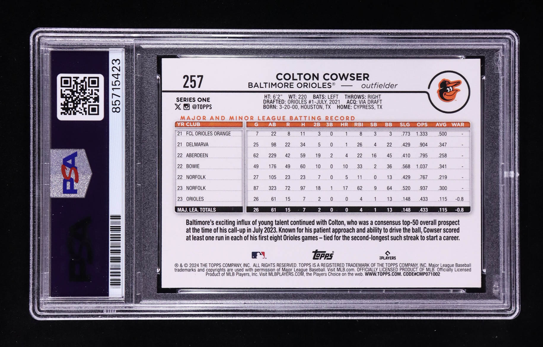 Colton Cowser Signed 2024 Topps Series One #257 RC (PSA | Autograph Graded PSA 10)