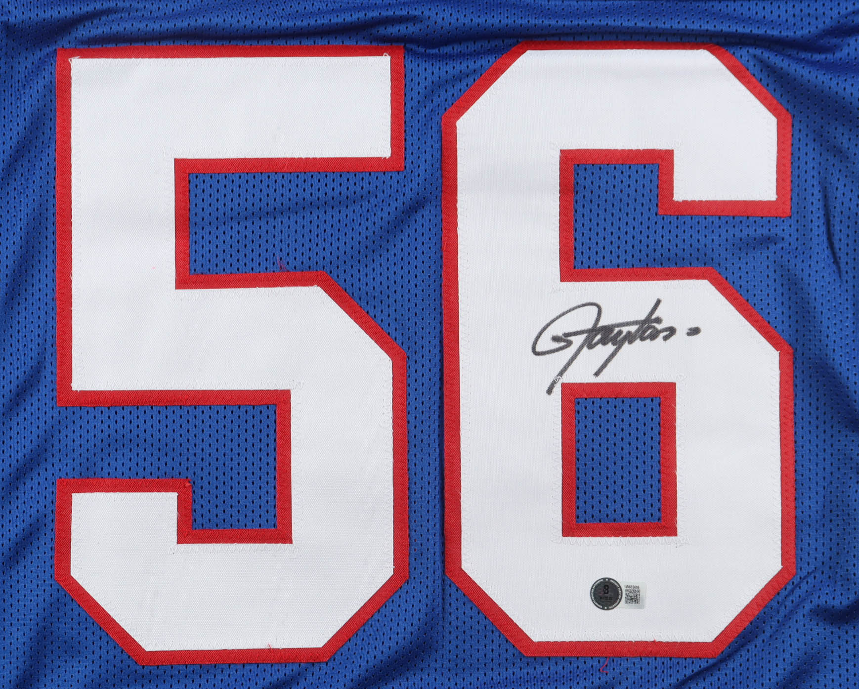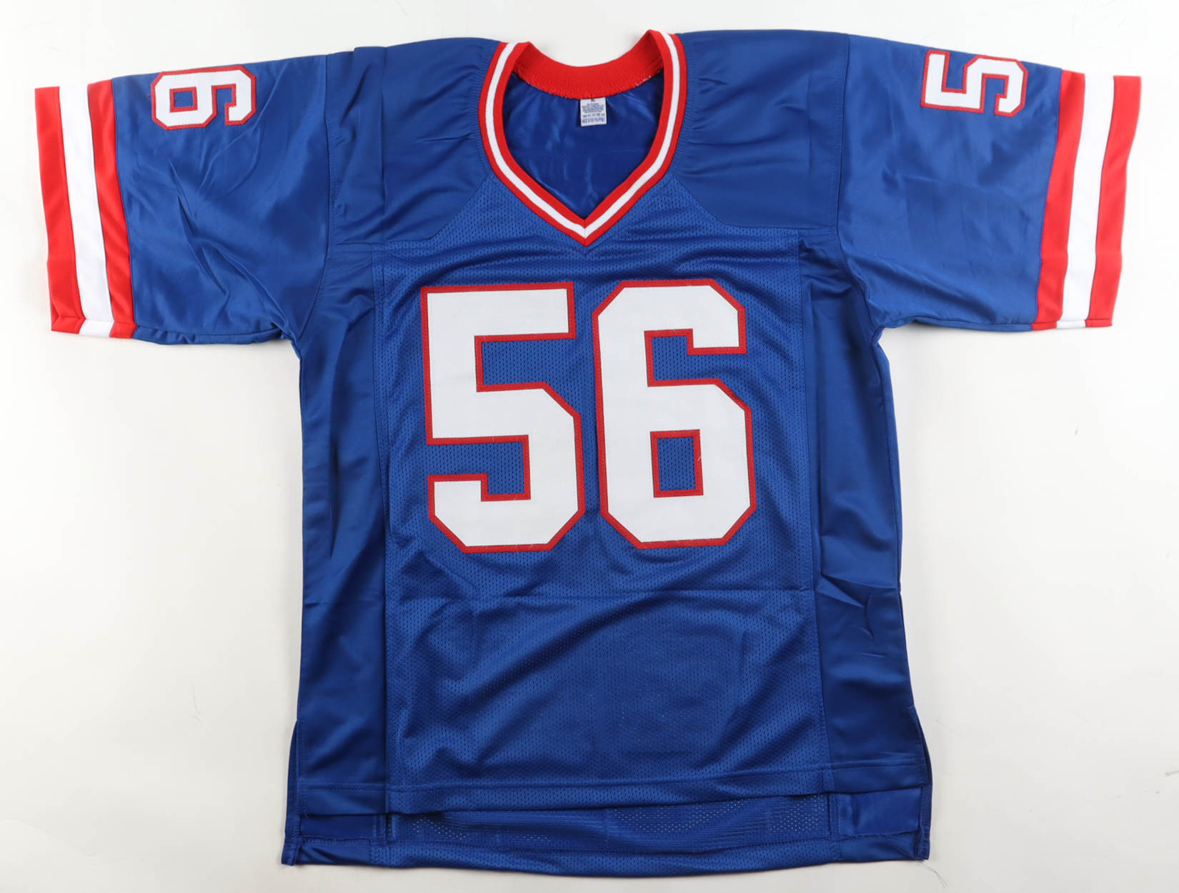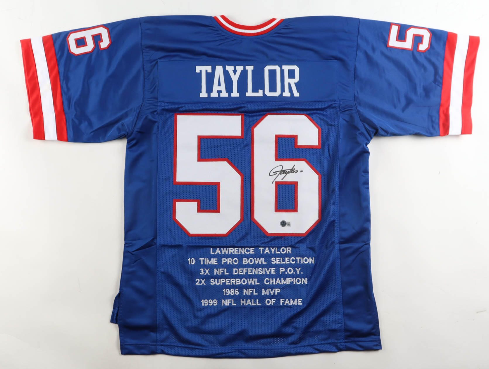 Custom jersey with everything sewn on, size XL. Hand-signed by Lawrence Taylor (HOF). Taylor's career highlights have been custom stitched onto the back of the jersey below the reverse numbers.