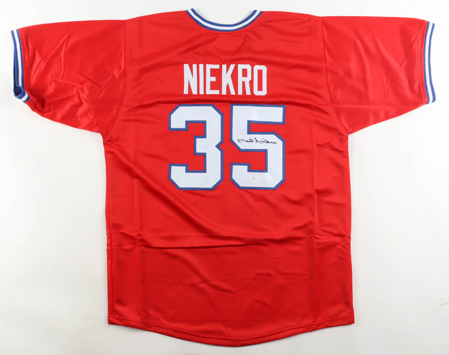 Custom jersey with everything sewn on, size XL. Hand-signed by Phil Niekro (D. 2020, HOF). Please note, the signature has bled.