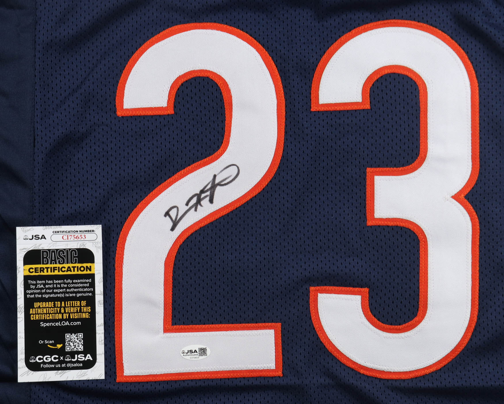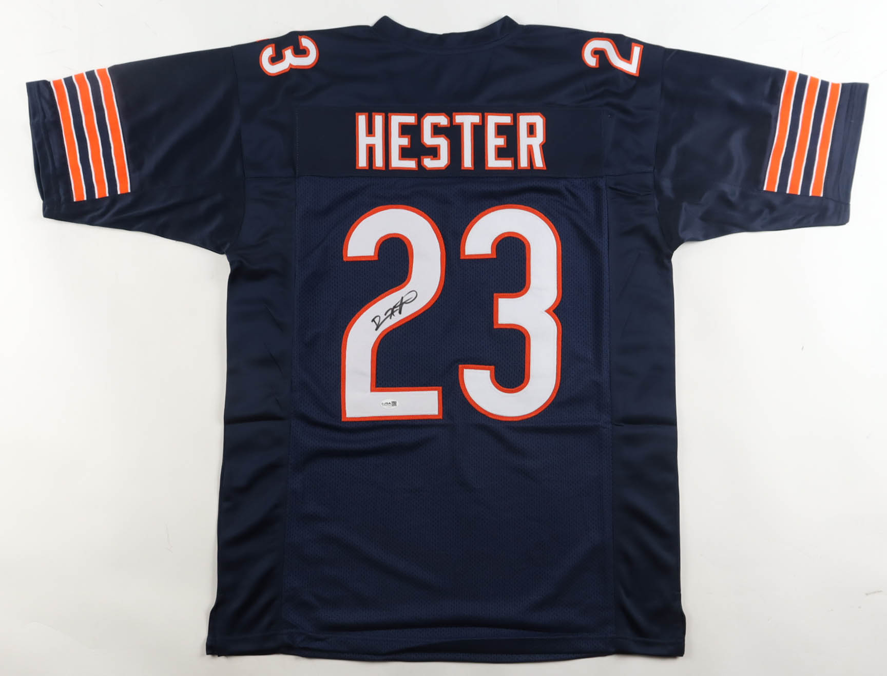 Custom jersey with everything sewn on, size XL. Hand-signed by Devin Hester (HOF).