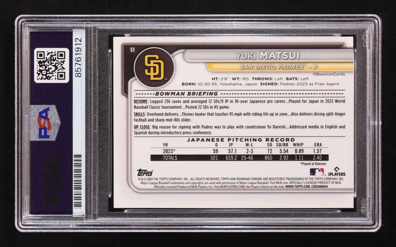 Yuki Matsui Signed 2024 Bowman Chrome #51 RC (PSA)