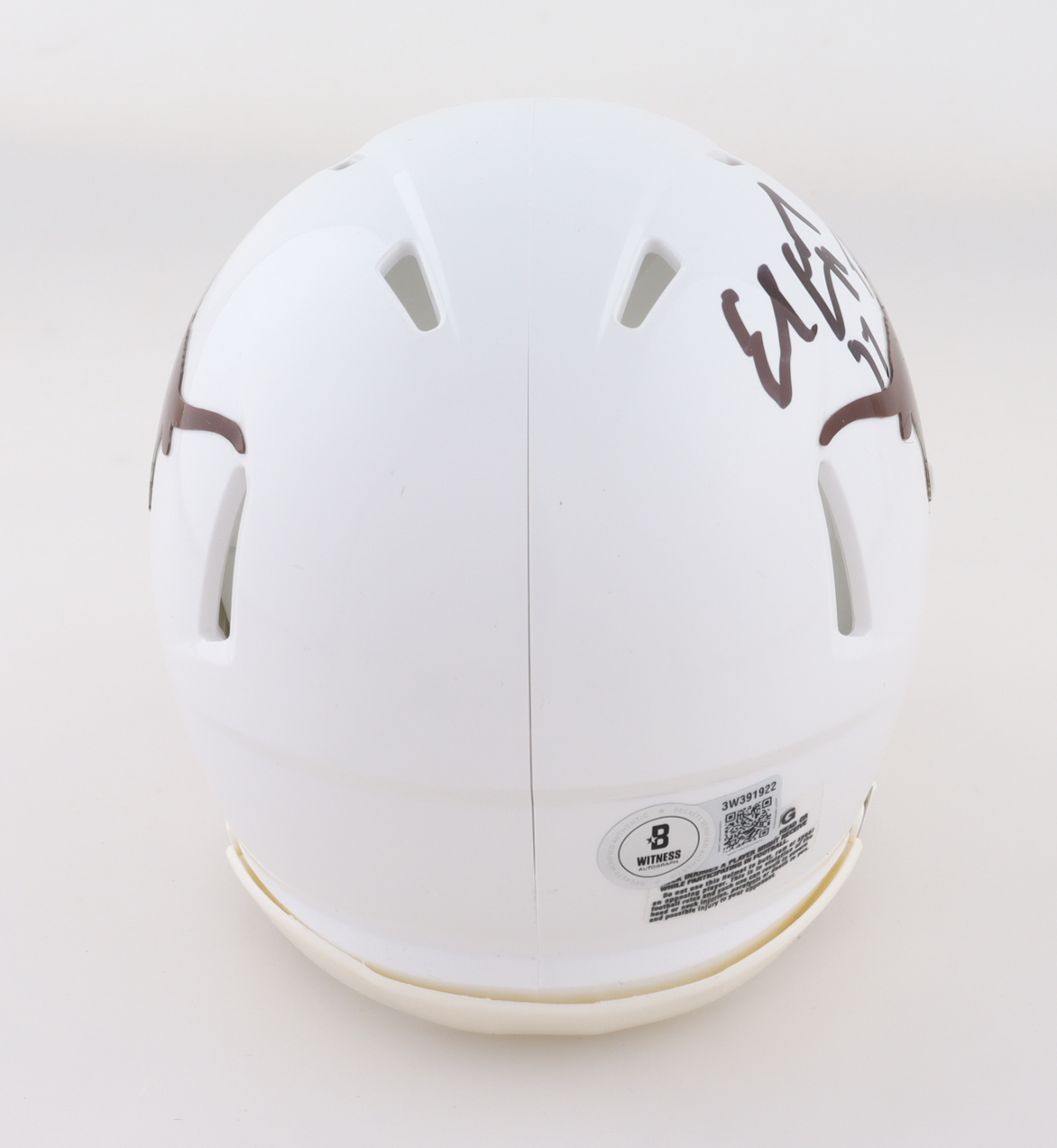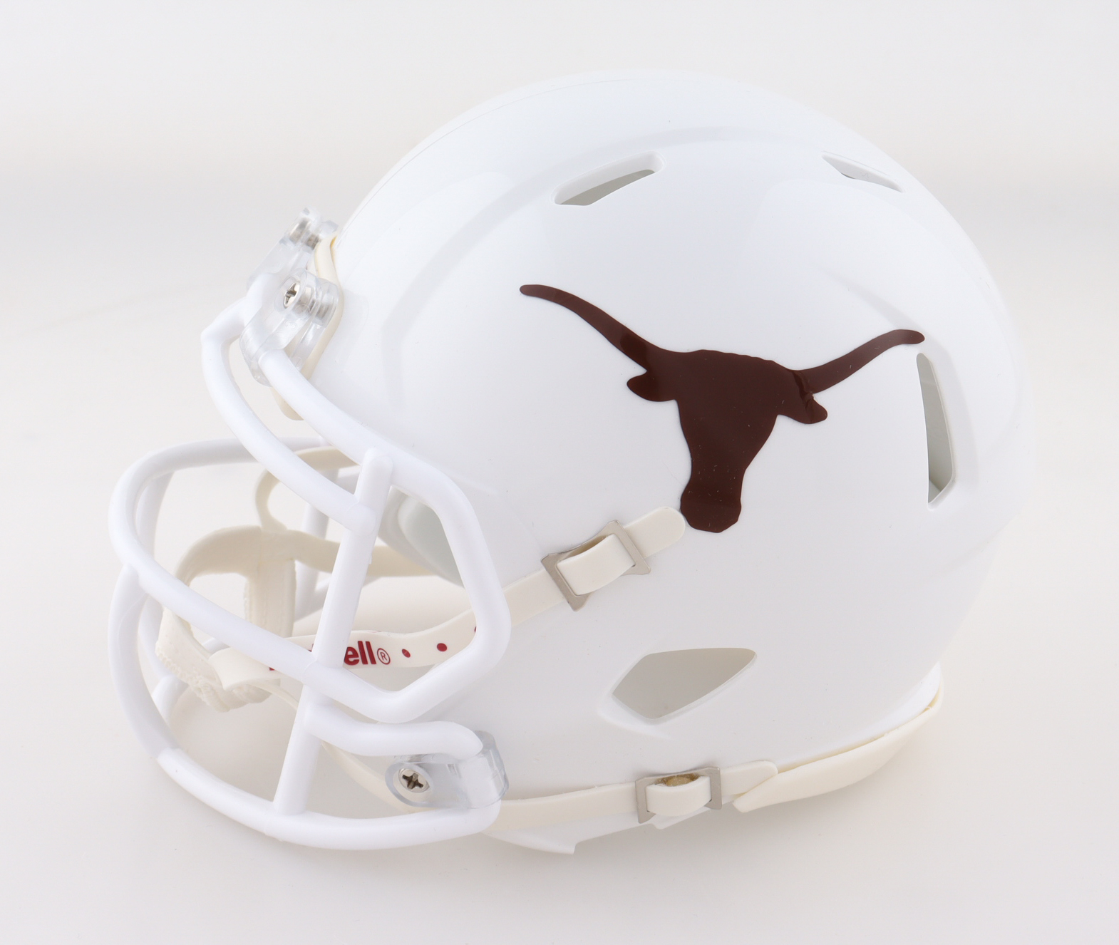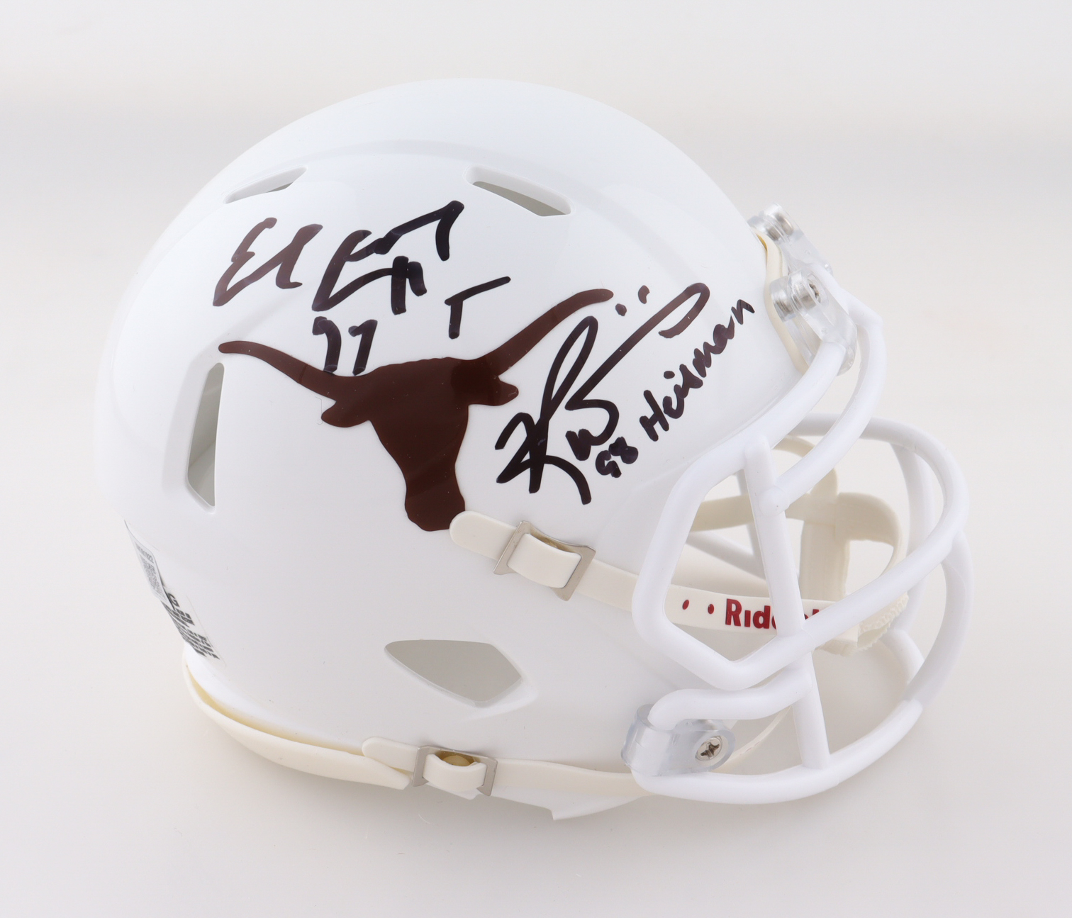 Riddell Texas Longhorns Speed mini helmet has been hand-signed and inscribed by Earl Campbell and Ricky Williams.